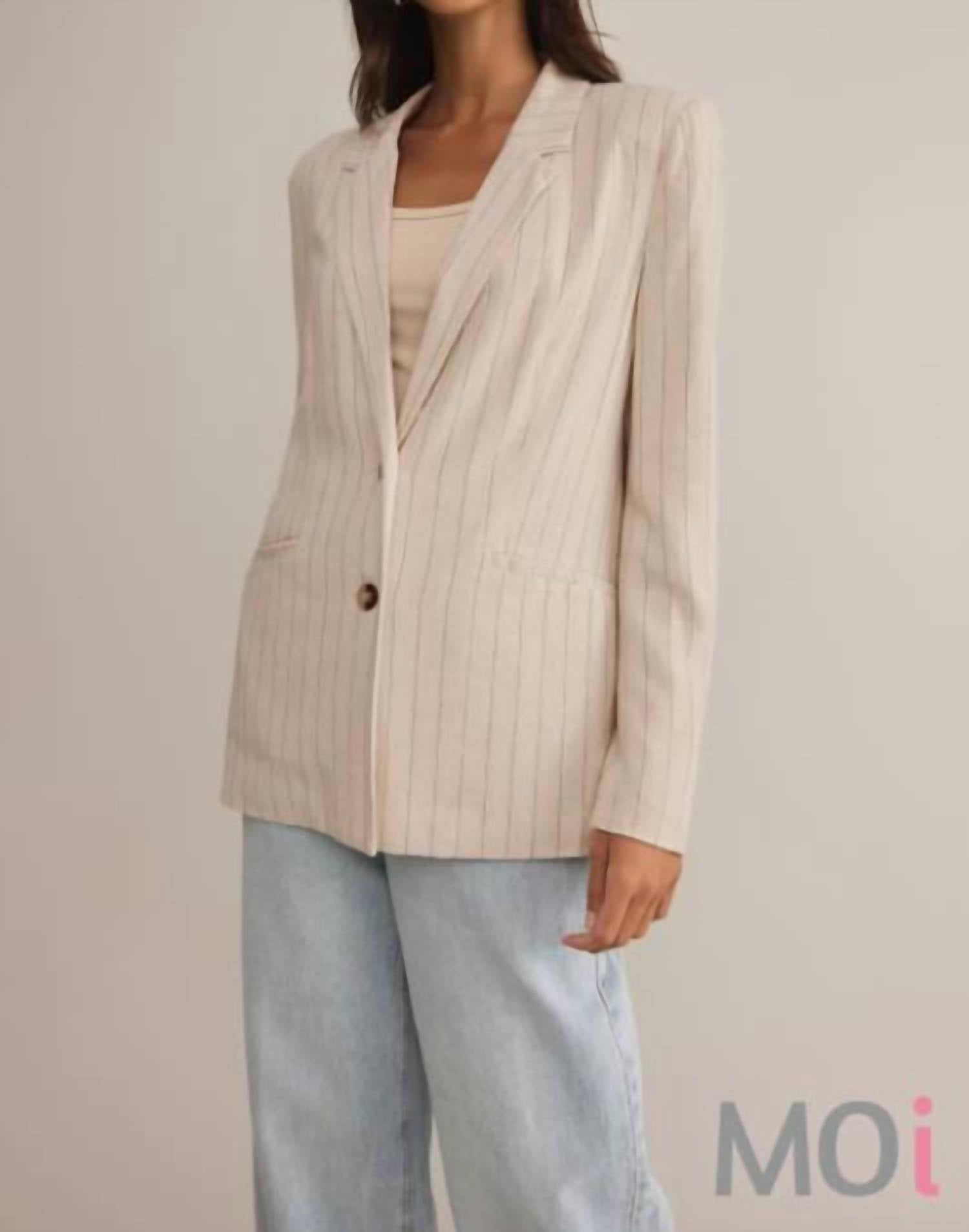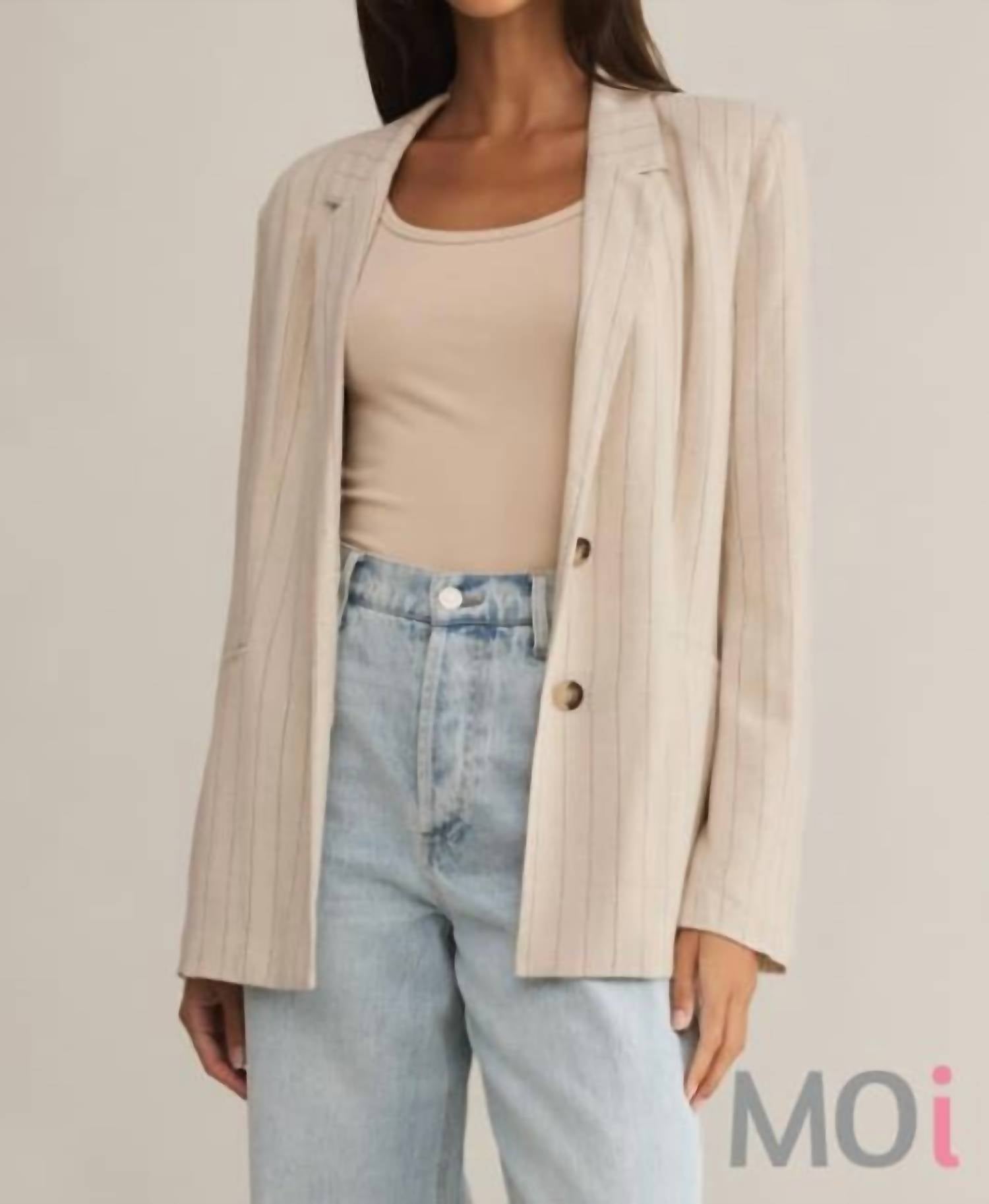 Um blazer tão versátil que você pode usá-lo no escritório ou combiná-lo com jeans para um visual mais casual. Incremente seu guarda-roupa com o Blazer Livingston Pinstripe da Z Supply na elegante cor Flax. Este blazer feminino possui mangas longas, fecho frontal com botões e gola clássica, proporcionando um caimento relaxado para um conforto elegante. Confeccionado em uma mistura texturizada de 80% Viscose e 20% Linho, inclui um bolso embutido e exala um toque macio e de gramatura média. O cuidado é simples, com instruções de lavagem à máquina e a recomendação de secar na horizontal.