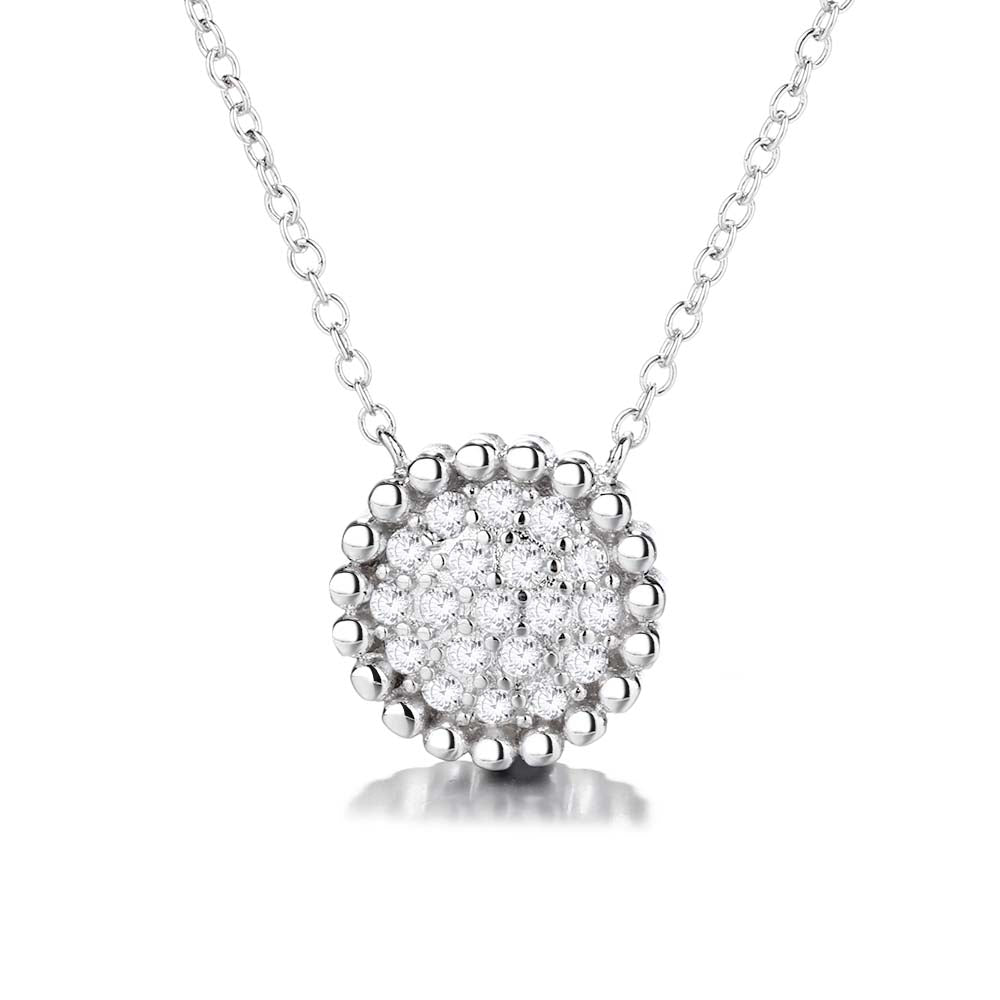 O pingente do colar apresenta um grande cristal redondo, cravejado de cristais menores. A combinação do cristal maior com os pequenos cria um efeito deslumbrante e deslumbrante, permitindo que o pingente capte a luz e brilhe intensamente.