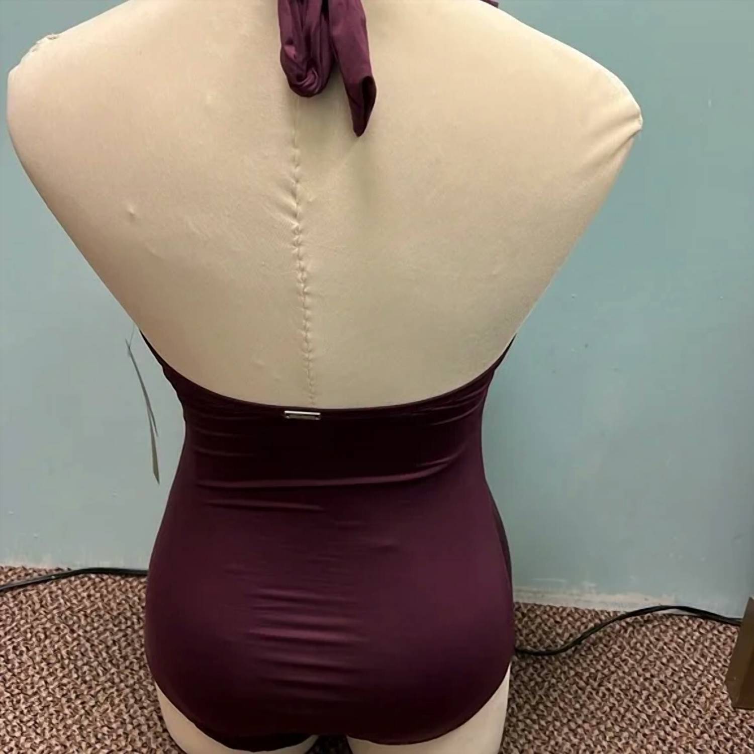 A one piece so chic you could even wear it as a bodysuit with your favorite pair of jeans. Elevate your beach day style with the Women's Halter Ruffle One Piece Swimsuit by Perry Ellis in an elegant plum hue. This sophisticated swimwear piece boasts a plunging neckline adorned with a chic ruffle detail and a stylish halter back, embodying the quiet luxury trend. Designed exclusively for women, it offers full coverage and a low rise, making it ideal for a summer getaway. Care for it with ease by hand washing to maintain its pristine condition.