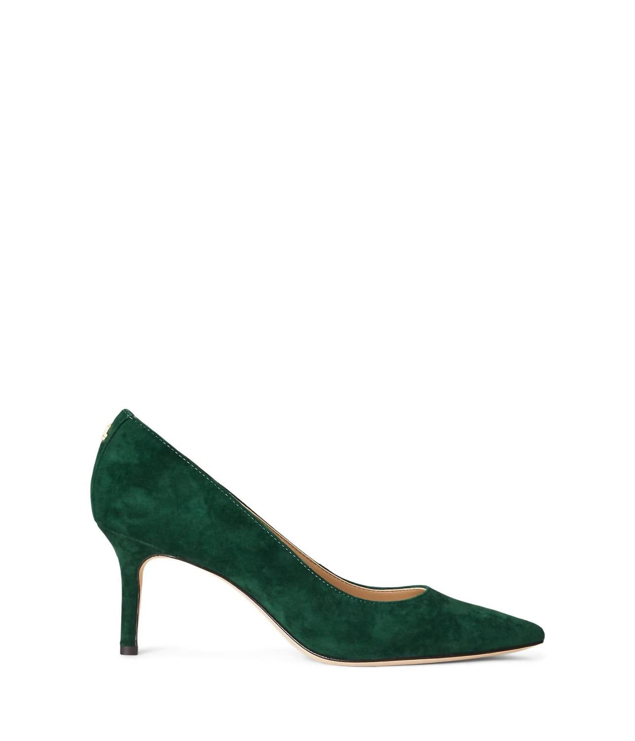 Elevate your look with the Women's Lanette Pointed-toe Pumps Sandal by RALPH LAUREN, a perfect choice for Spring's dinner parties. Constructed in dark green suede and leather, these sandals feature a slip-on design with a pointed toe and a chic stiletto heel. The lightly padded footbed and breathable synthetic lining ensure comfort for extended wear.