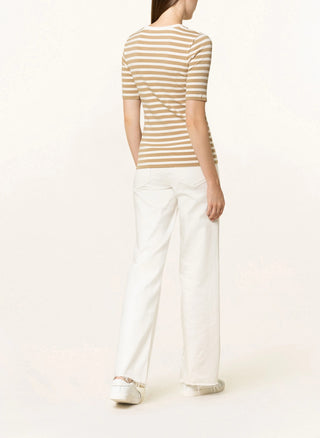 Camiseta feminina Ralph Lauren listrada de algodão misto Henley, bege, tamanho extragrande