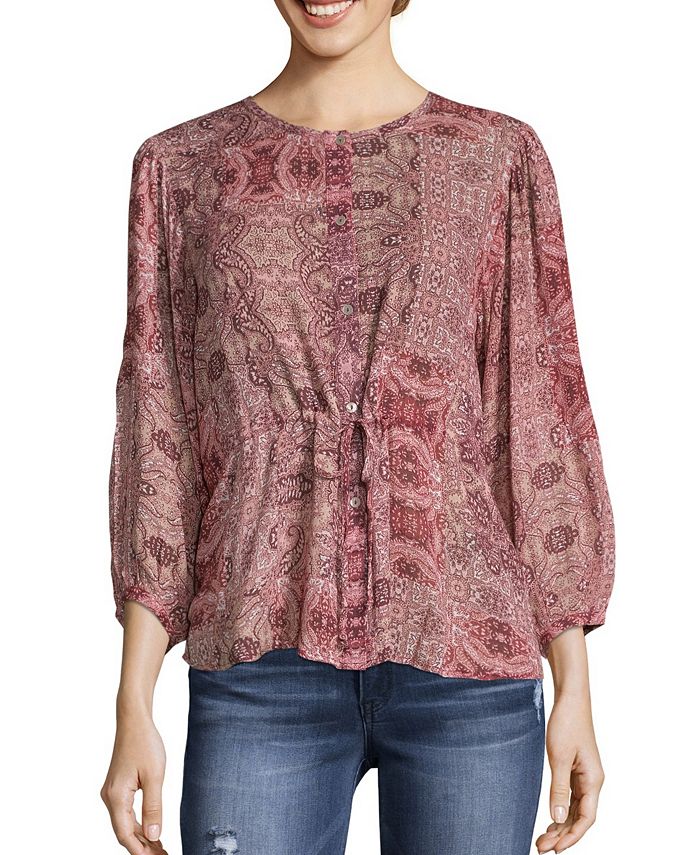 Esta blusa estampada estilosa tem um cordão ajustável na cintura para criar um efeito de ajuste. Perfeita para combinar com jeans ou calças pretas. | Botões na frente | Cordão ajustável | Mangas 3/4 | Gola redonda | Viscose | Lavar à mão