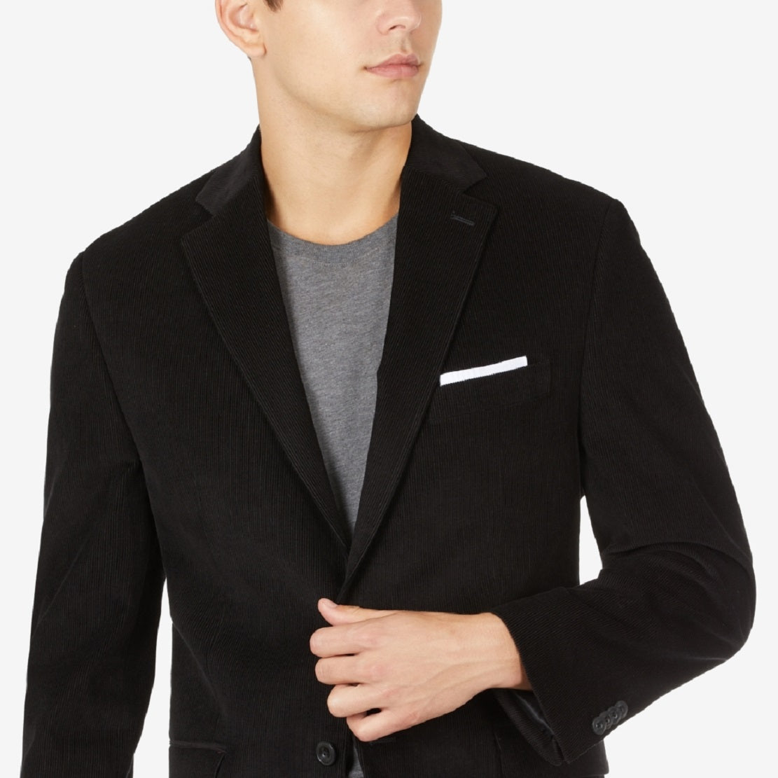 O tamanho da jaqueta é indicado por um número e uma letra; O número se refere ao tamanho do peito | A letra se refere ao comprimento da jaqueta com base na altura; P = 1,70 m e menos; R = 1,80 m-1,80 m; G = 1,80 m e mais | O ajuste moderno apresenta um ajuste atlético nos ombros | peito e cintura com cavas mais altas e mangas mais ajustadas | Lapelas entalhadas | Dois bolsos frontais com aba; bolso embutido no peito esquerdo | Fecho de dois botões; punhos de quatro botões