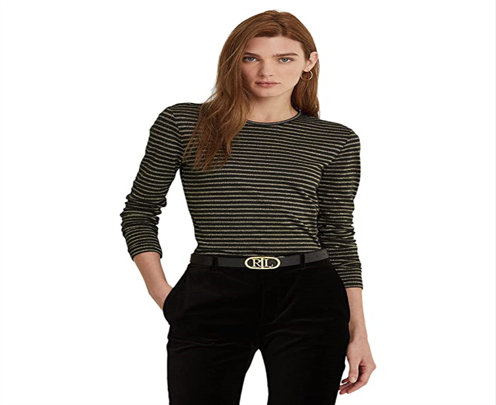 Camiseta Ralph Lauren Feminina Listrada Metálica Preta Tamanho P