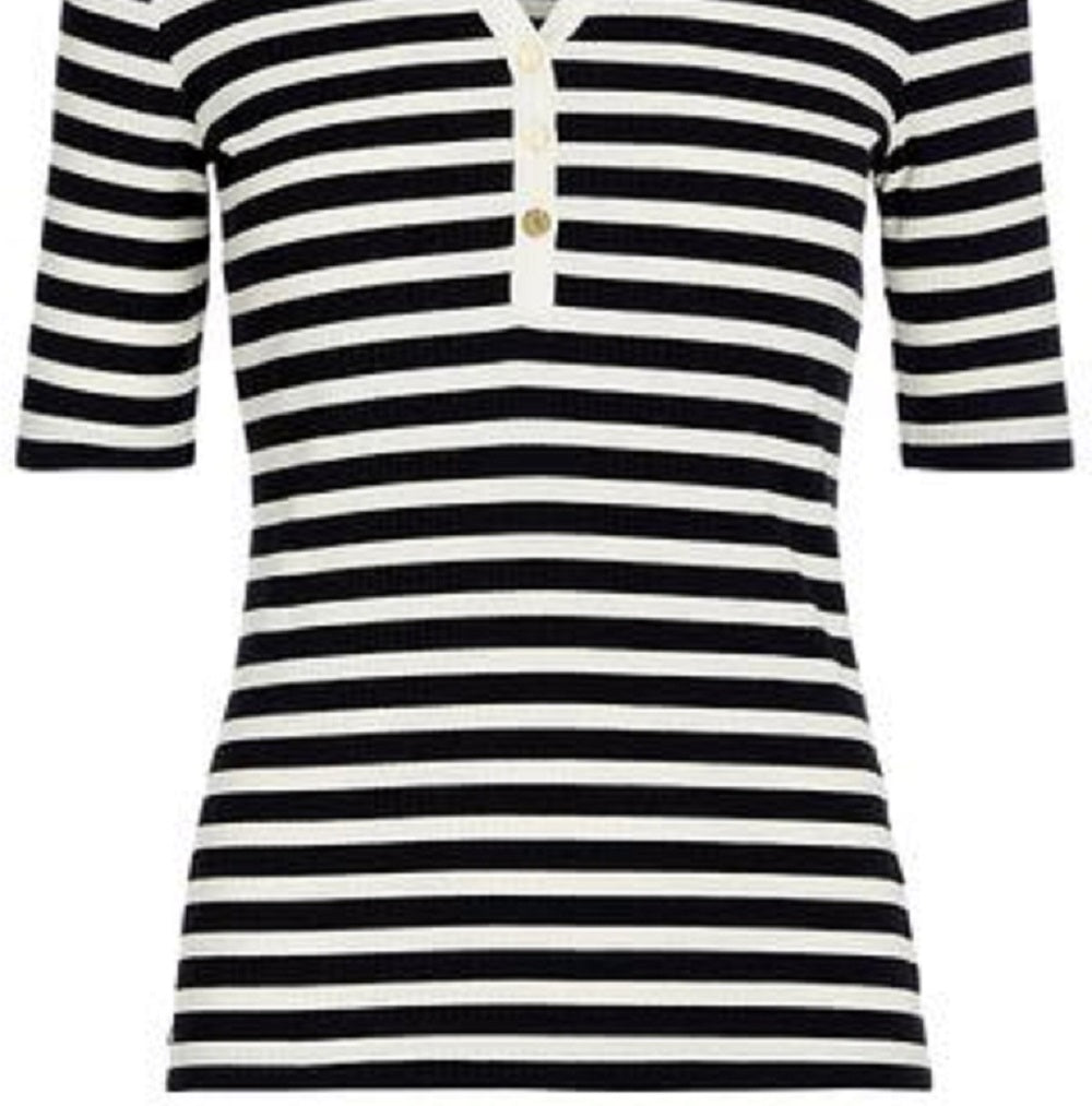 Camiseta feminina Ralph Lauren listrada de algodão misto Henley, preta, tamanho X-S
