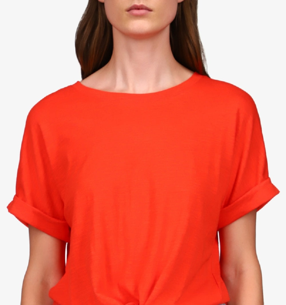 A camiseta All Day da Sanctuary leva as coisas a outro nível com bainha amarrada e mangas curtas com punho. | Gola redonda | Amarrações na frente da bainha; mangas com punho | Algodão/rayon | Lavável à máquina | Importado