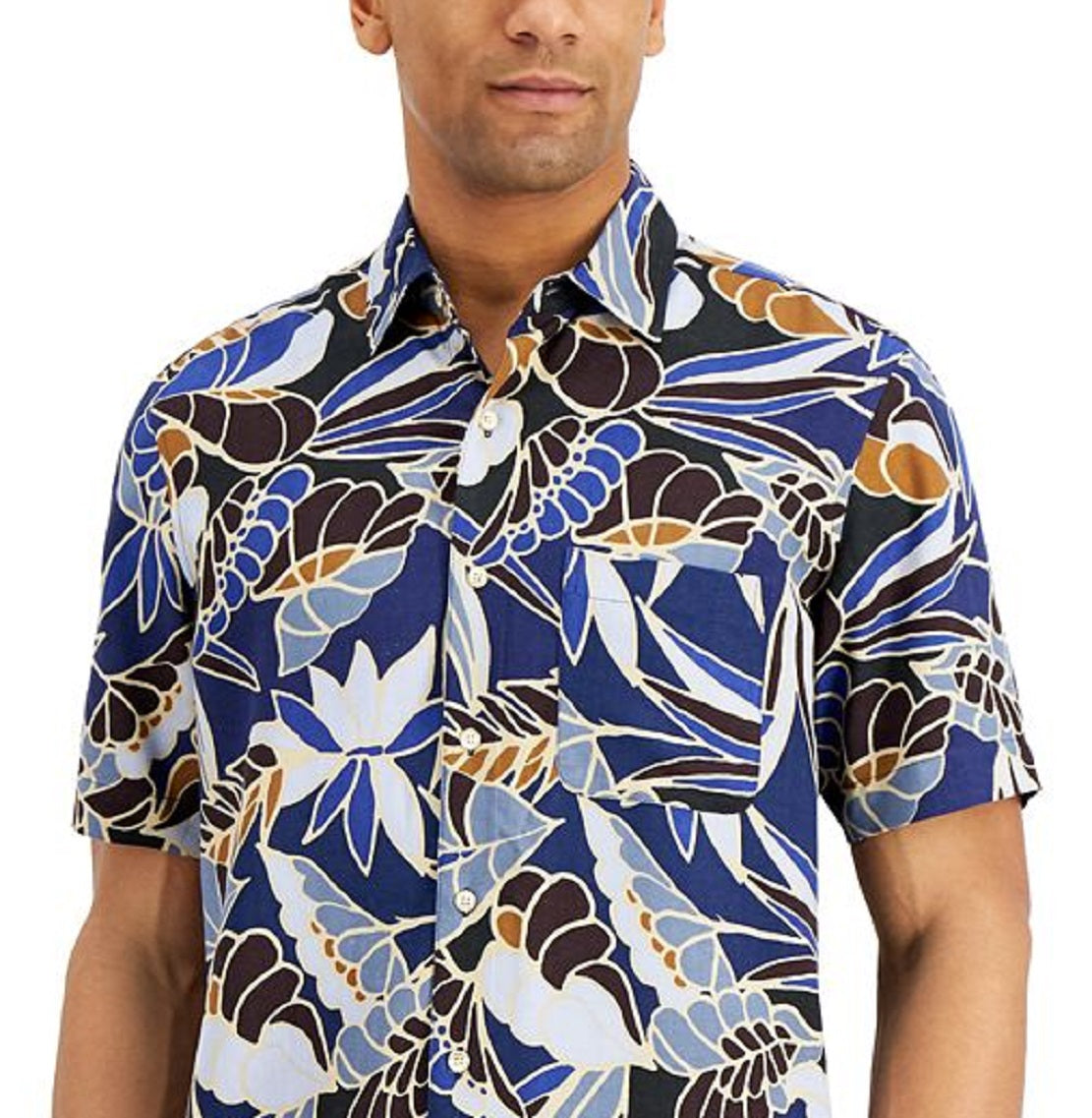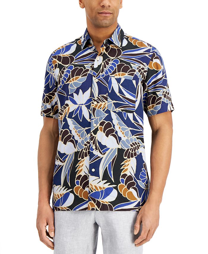 Dê vida nova às suas camisas com botões com o ousado padrão floral que dá estilo a esta camisa confortável da Tasso Elba. | Gola aberta | Estampa de folhas; bolso aplicado no lado esquerdo do peito | | Seda/rayon | Lavável à máquina | Importado