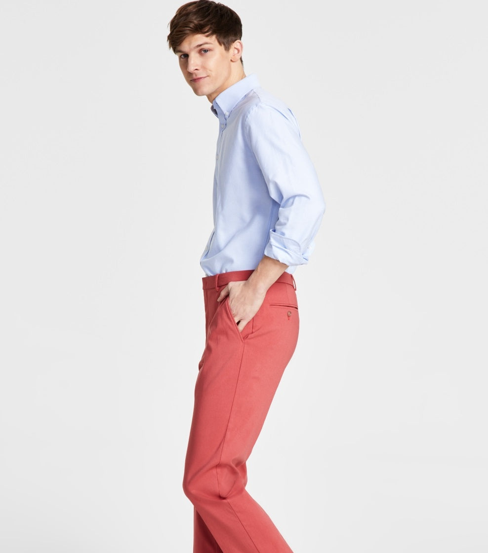 Dois bolsos laterais com fenda; dois bolsos traseiros embutidos com botões | Braguilha com zíper e fecho de botão e gancho; passantes para cinto | Calças justas com perna afunilada | Sem forro | Importado | Cós superelástico e confortável | Frente lisa