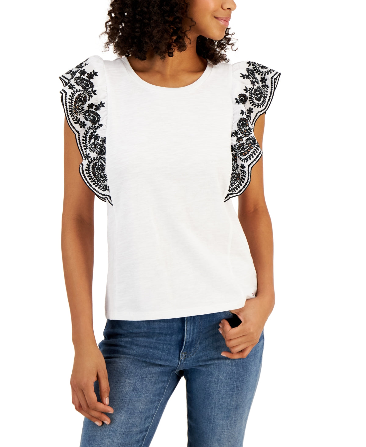 Fresco e arejado, todo em algodão | este top Tommy Hilfiger aprimora seu visual com mangas esvoaçantes com ilhós bordados. | Aproximadamente 60 cm de comprimento | Gola redonda | Mangas esvoaçantes com ilhós bordados | Todo em algodão | Lavável à máquina