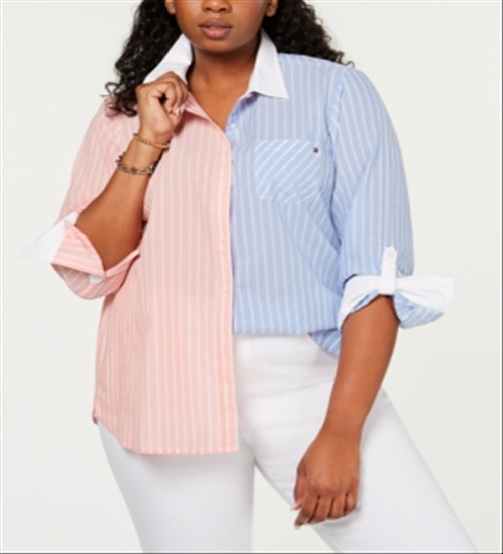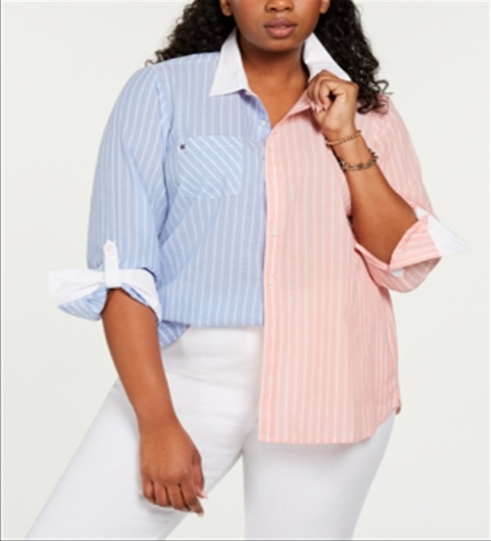 Tommy Hilfiger usa listras contrastantes para criar um acabamento em blocos de cores em dois tons nesta camisa plus size | com abas dobradas para punhos elegantes. | Acabamento no quadril | Gola pontuda; fechos frontais com botões | Coloração em dois tons; bolso aplicado no peito | Mangas compridas com abas dobradas |