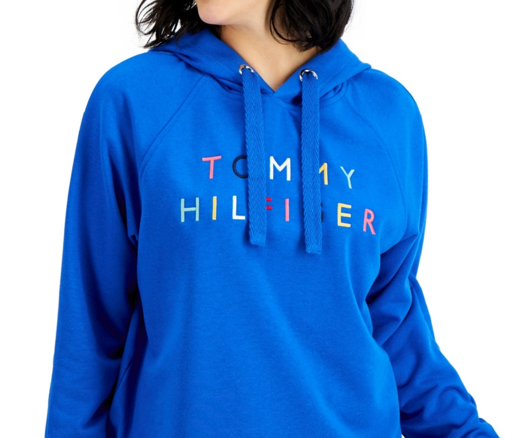 Tommy Hilfiger Moletom com capuz feminino raglan bordado azul tamanho grande