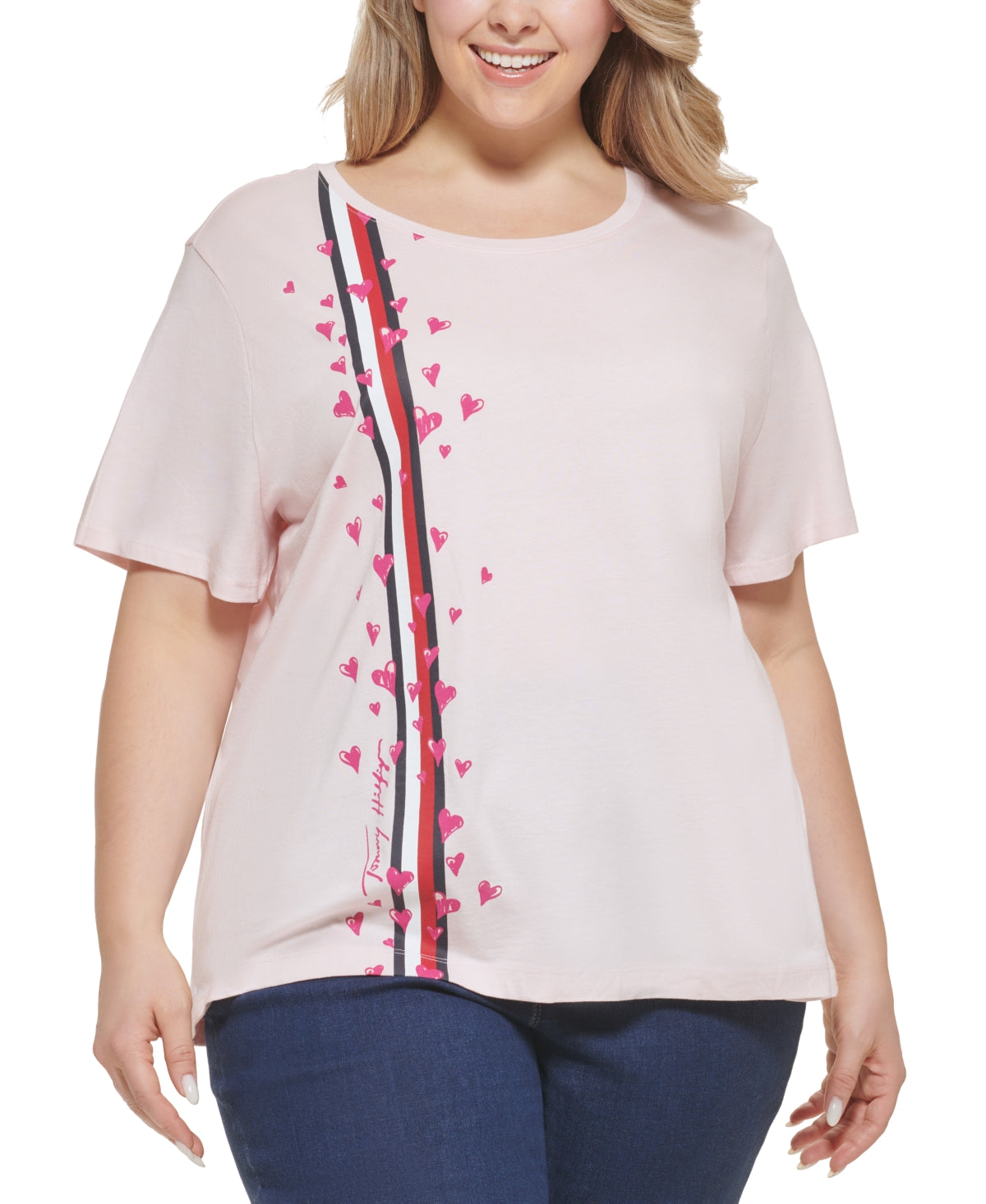 Corações flutuantes dão um toque de extravagância a esta camiseta casual plus size da Tommy Hilfiger. | Comprimento aproximado de 27 | Gola redonda | Estampa de corações flutuantes na frente; bordado de bandeira no punho da manga | Algodão/modal | Lavável à máquina | Importado