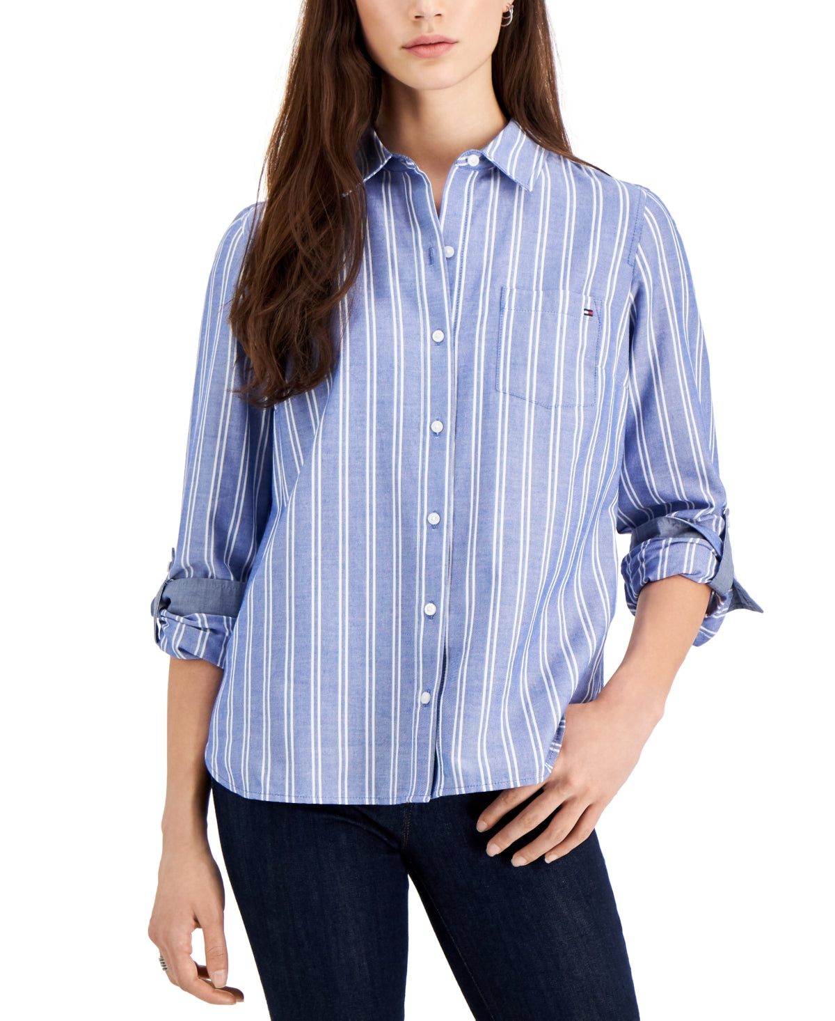 Um clássico que está sempre estiloso com um suéter, blazer ou sozinho, esta camisa listrada da Tommy Hilfiger tem abas que permitem que você mude as coisas
