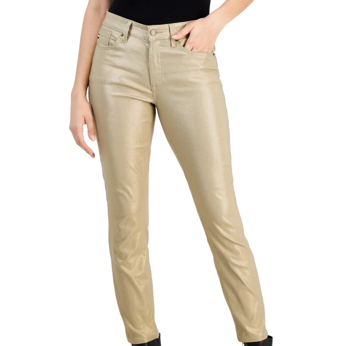 Calça jeans skinny feminina Tommy Hilfiger Tribeca com tornozelo metálico, amarela