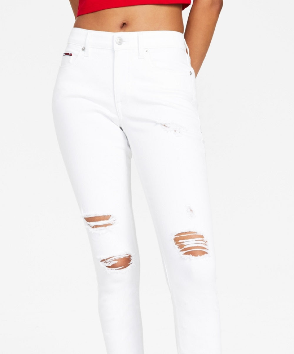 Calça jeans skinny feminina Tommy Jeans rasgada, cintura média, branca, tamanho 31