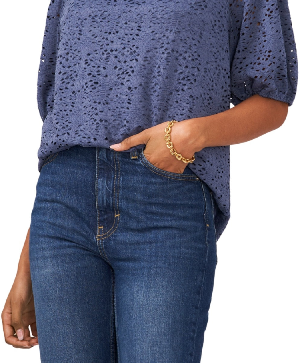 Deixe seus ombros falarem por si com este top chique com ilhós da Vince Camuto. | Decote ombro a ombro | Detalhes de ilhós em toda a peça | Mangas bufantes até o cotovelo | Corpete forrado | Parte externa; poliéster/elastano; forro; poliéster | Lavável à máquina