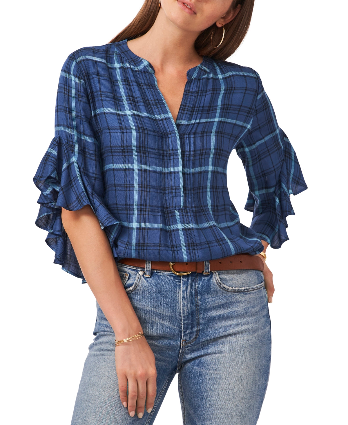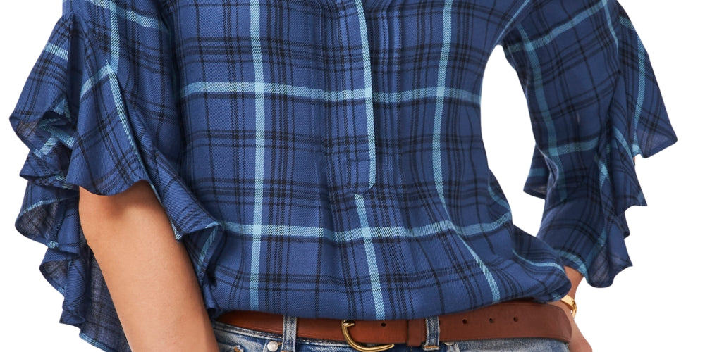 Babados fluidos dão um toque chique ao xadrez clássico com esta blusa estilo henley da Vince Camuto. | Comprimento aproximado de 66 cm | Decote henley | Bainha peplum com babados | Mangas 3/4 com babados | Viscose | Lavável à máquina