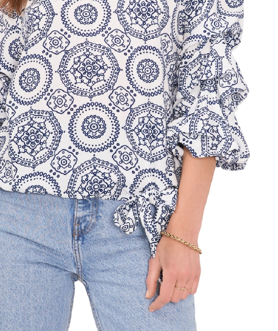 Exiba seus ombros com o top ombro a ombro de Vince Camuto | um design plus size decorado com uma estampa boho-chic e finalizado com divertidas mangas bufantes 3/4 e bainha amarrada