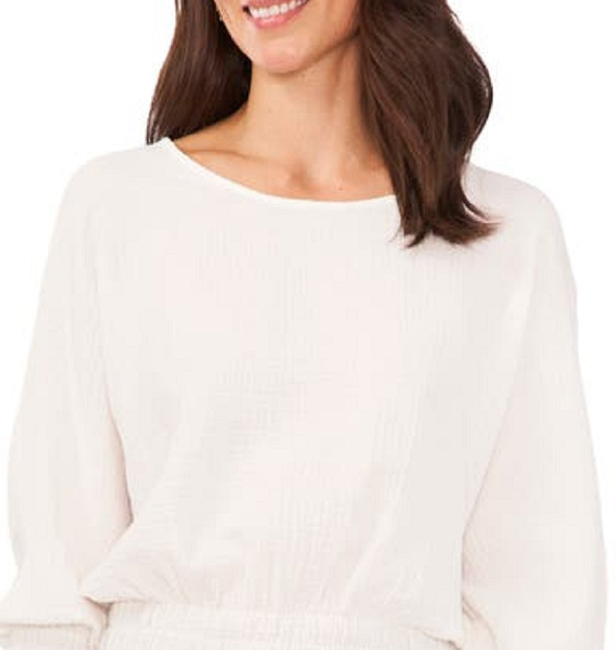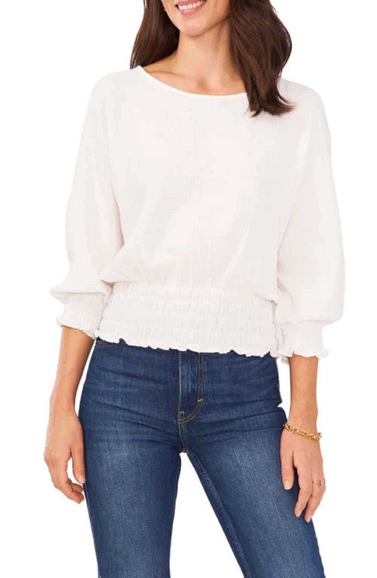 Um charme doce com infinitas opções de estilo | este top transparente Vince Camuto apresenta franzidos nos punhos e na cintura para um caimento deslumbrante. | Gola redonda | Cintura franzida | Mangas 3/4 com punhos franzidos | Poliéster | Lavável à máquina