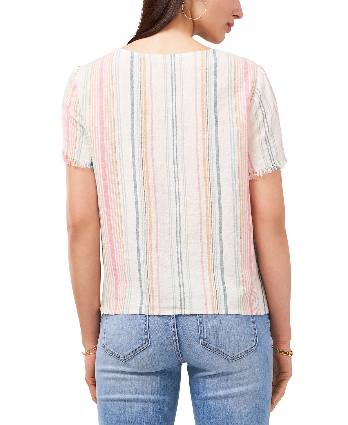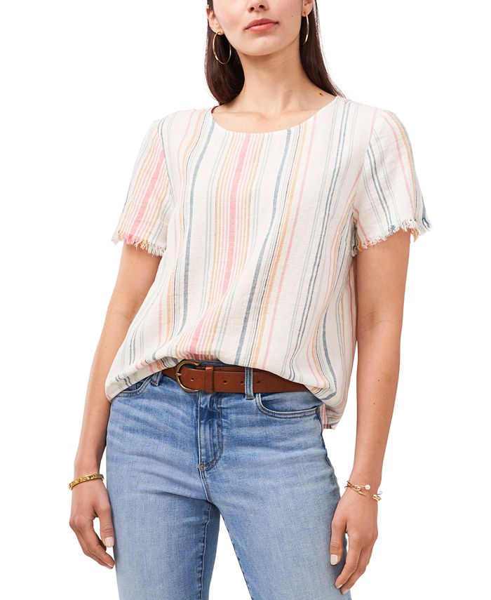 Listras que combinam com tudo trazem infinitas opções de estilo para esta blusa Vince Camuto. Mangas desfiadas dão um toque especial ao tecido premium. | Comprimento aproximado de 56 cm | Gola redonda | Mangas curtas desfiadas | Linho/rayon | Lavável à máquina | Importado