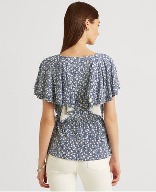 Blusa Ralph Lauren Feminina com Babados, Gancho e Olho Frontal, Manga Flutuante, Gola V, Peplum, Azul, Tamanho Grande