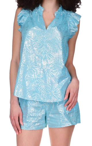 Blusa feminina Michael Kors com estampa de folha de algodão e babados, azul, tamanho grande