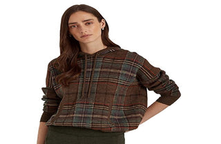 Suéter com capuz Ralph Lauren feminino xadrez de lã merino, tamanhos variados, médio
