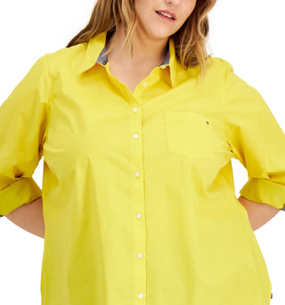 Camisa Tommy Hilfiger feminina de algodão com aba enrolada, amarela, tamanho 2X