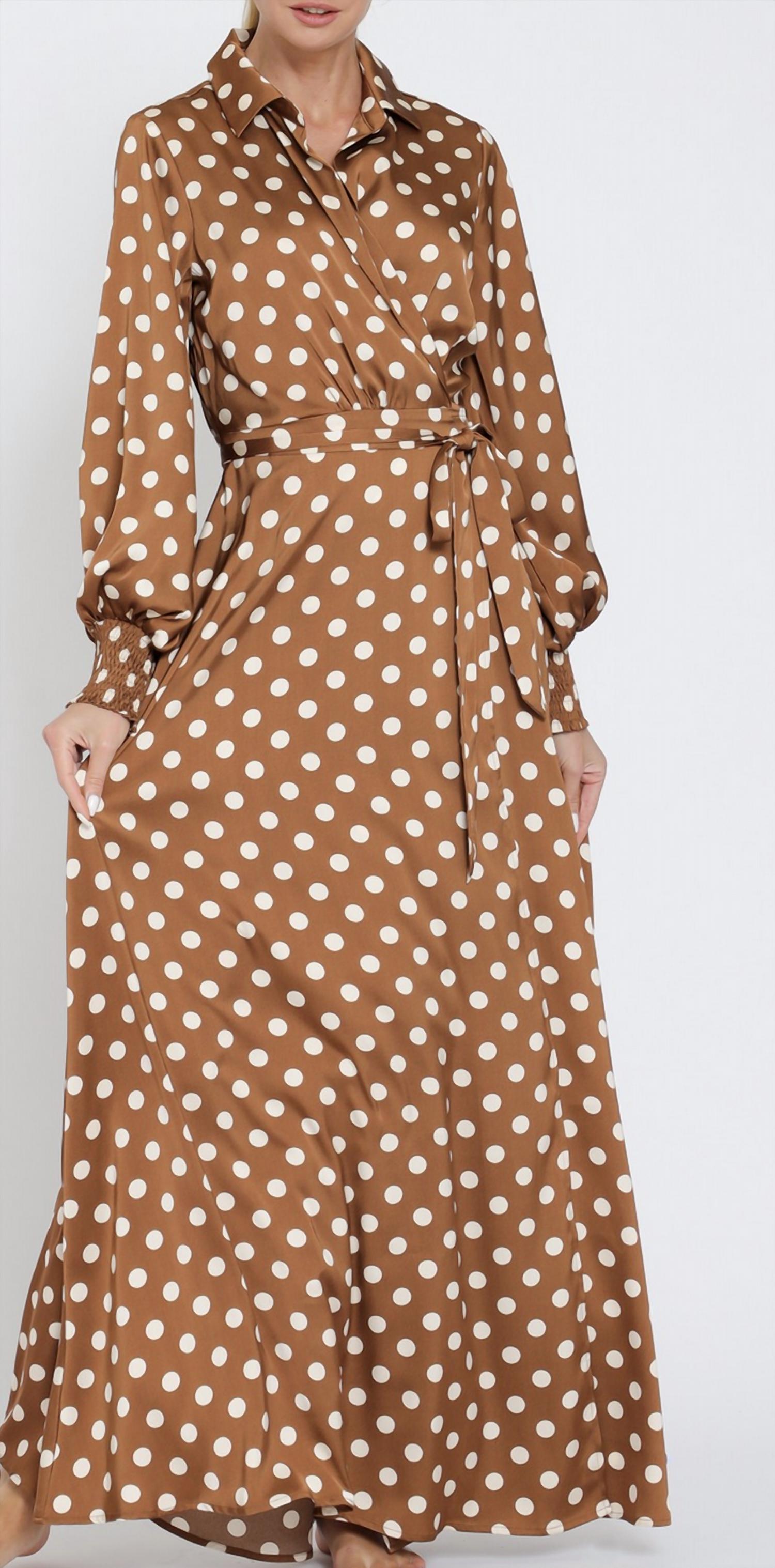 Discover the Aakaa Polka Dot Long Sleeve Wrap Maxi Dress, a statement piece perfect for a summer vacation or Mother's Day celebration. With its elegant A-line silhouette, this dress comes in a playful brown polka dot pattern and features a button closure and a stylish collar neckline. Made with a keen eye for maximalist trends, this garment offers refined sophistication. Care instructions recommend a gentle hand wash and line drying to maintain its pristine look.