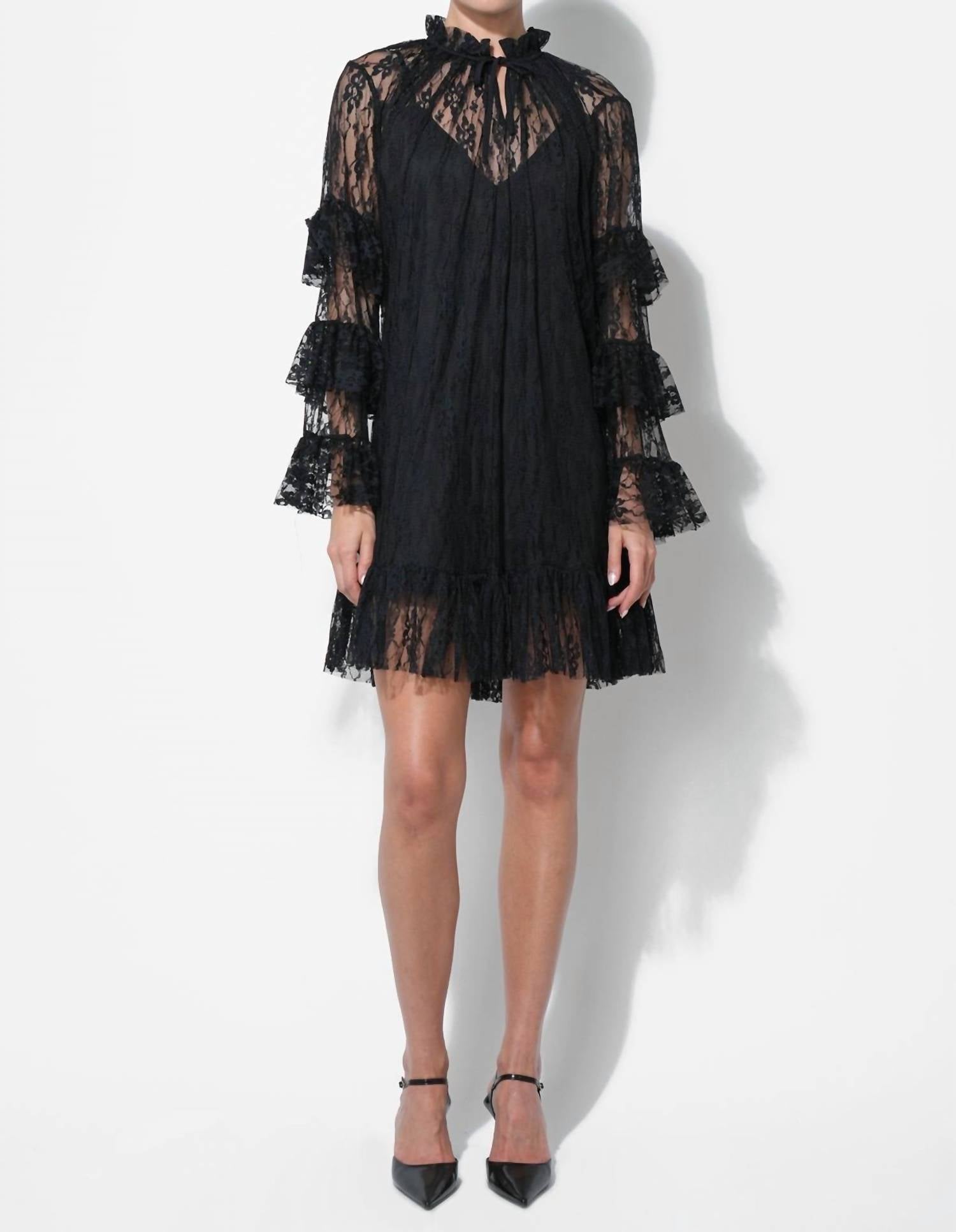 The perfect mini dress for those warmer months. Discover the Adelyn Rae Lorena Lace Ruffled Shift Dress, a sophisticated choice for any elegant soirée. This dress features a long sleeve design with a textured pattern, crafted for timeless appeal. The shift silhouette and mockneck keep you stylishly comfortable, enhanced by delicate lace and ruffle details. Perfect for evening events, this mini dress in classic black is an essential addition to your spring wardrobe.