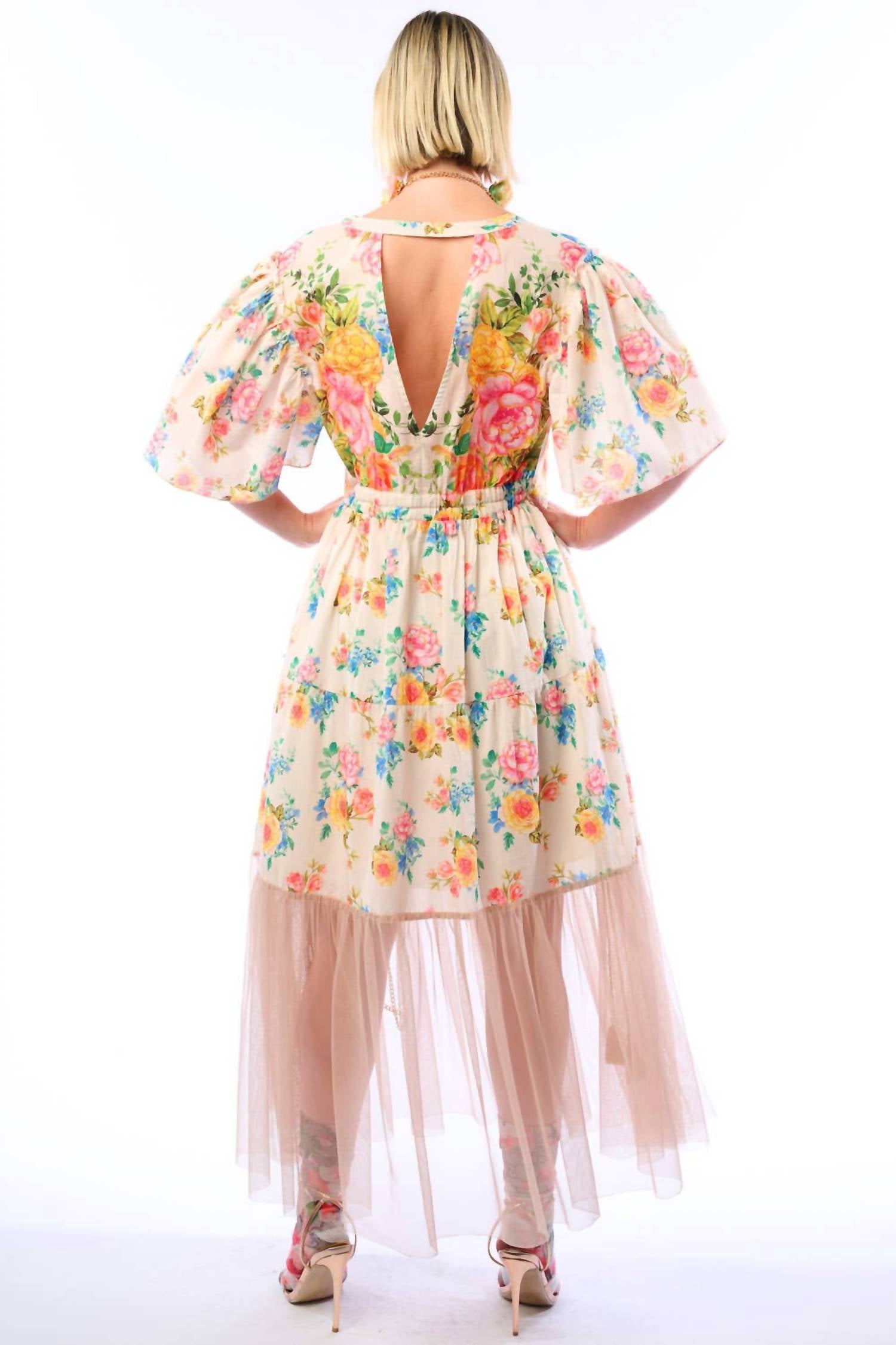 Who doesn't love a good maxi dress? This one you'll be reaching for season after season. Introducing the Earth Angels Maxi Dress by Aratta, a boho chic piece designed to make a statement. Featuring elegant elbow sleeves, it's made from 100% cotton for breathable comfort. This dress exudes charm with its vibrant rose and peacock floral print and maxi tiered silhouette, complete with a mesh hem and braided tassel belt. Closure is via button closure, and convenience comes with 2 side pockets. Care for it by hand washing warm with like colors and line drying. A perfect choice for a holiday party or Easter gathering.