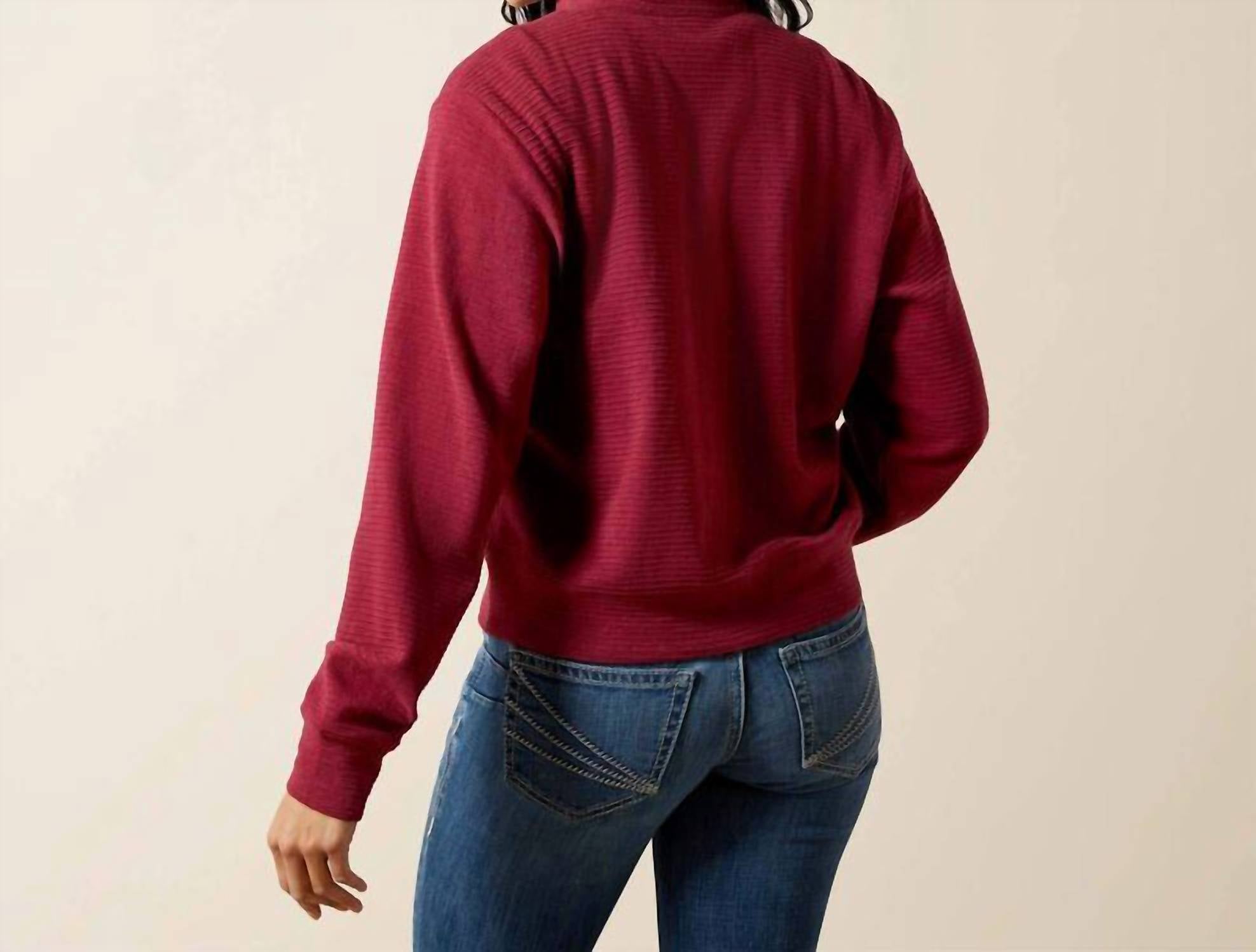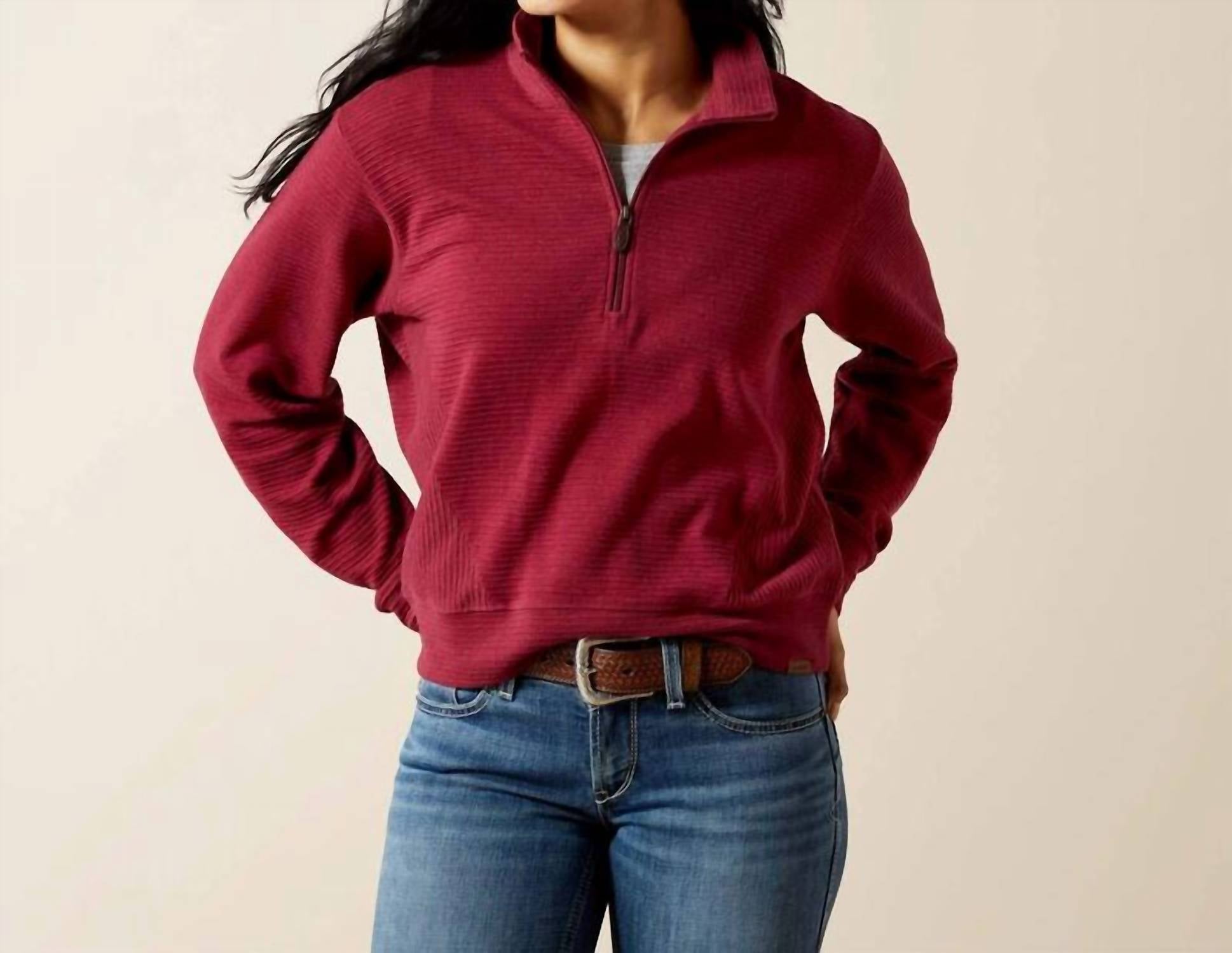 Introducing the ARIAT High Noon 1/2 Zip Pullover Sweatshirt in a rich Beaujolais hue, perfect for the Fall season and Thanksgiving occasions. Crafted with a textured cotton-blend fabric, composed of 60% Cotton and 40% Polyester, this monochrome piece offers comfort and style. It features long sleeves and a collar neckline for a cozy fit. With a convenient zip closure, this pullover is an ideal choice for vacations and casual wear.