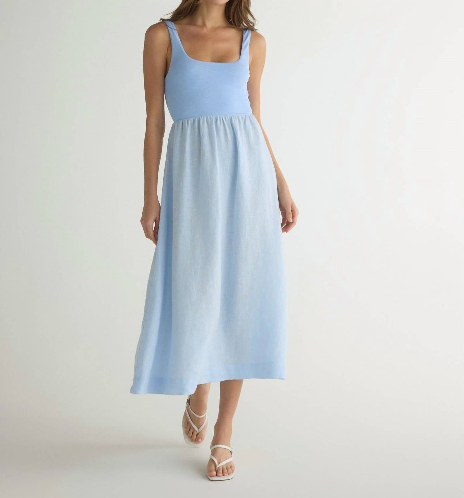 The Knit Combo Dress by Bella Dahl is a timeless addition to any summer wardrobe with its minimalist design in a soothing blue periwinkle hue. This women's dress is crafted from luxurious linen, featuring a sleeveless fit and flare silhouette with a scoopneck, perfect for a vacation occasion. Made for effortless style, it has a pull-on closure and boasts a solid pattern. Care is simple with machine wash instructions, allowing you to maintain this versatile piece with ease.