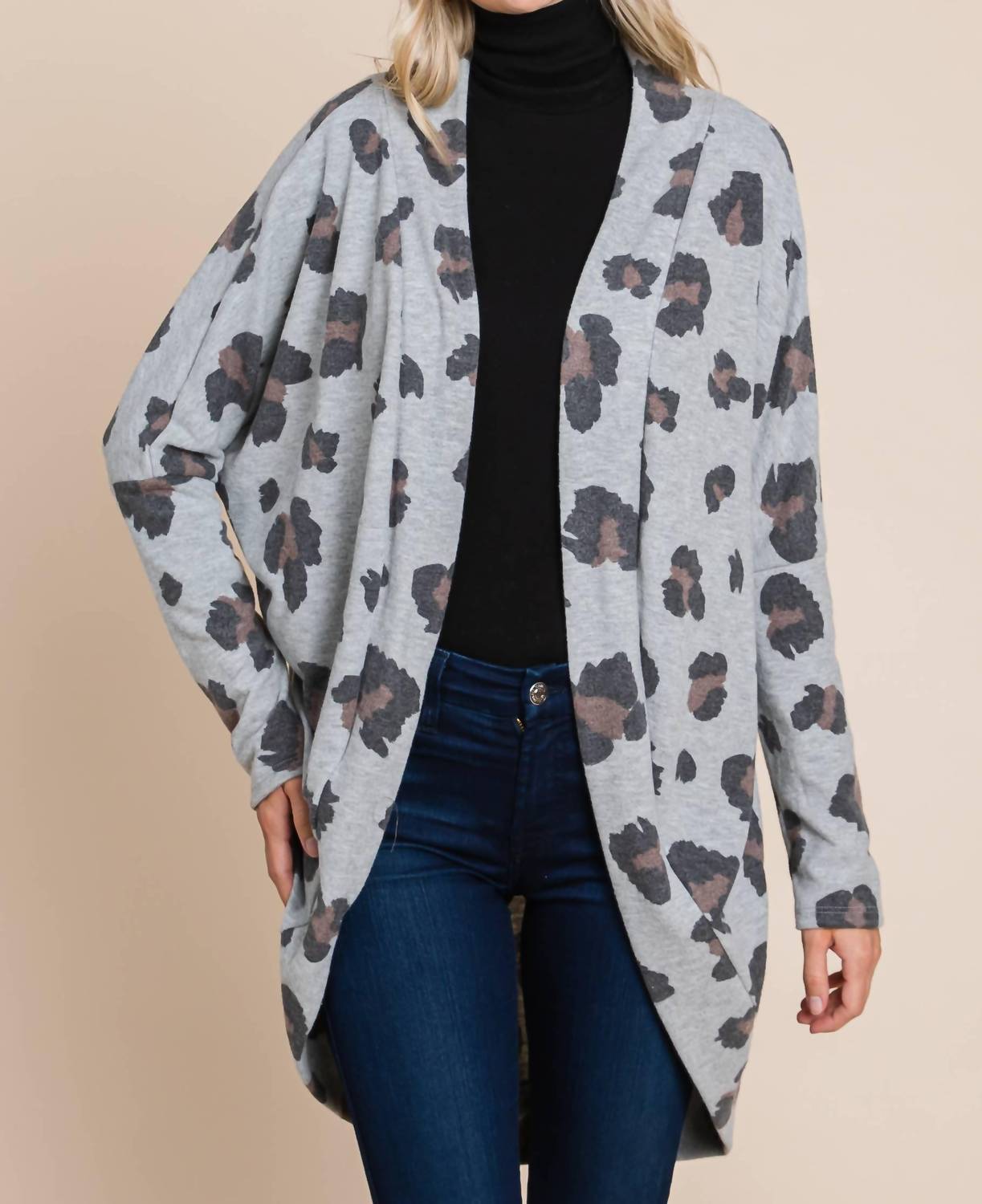 Embrace the cozy season with the BOMBOM Animal Print Knit Cardigan in Grey Multi, a stylish layering essential perfect for summer. This V-neck cardigan features long sleeves and a playful animal pattern, effortlessly complementing your favorite tops and dresses. Crafted from 95% Polyester and 5% Spandex, it boasts a pull-on closure and convenient pockets, all made in the USA. For optimal care, machine wash and lay flat to dry.