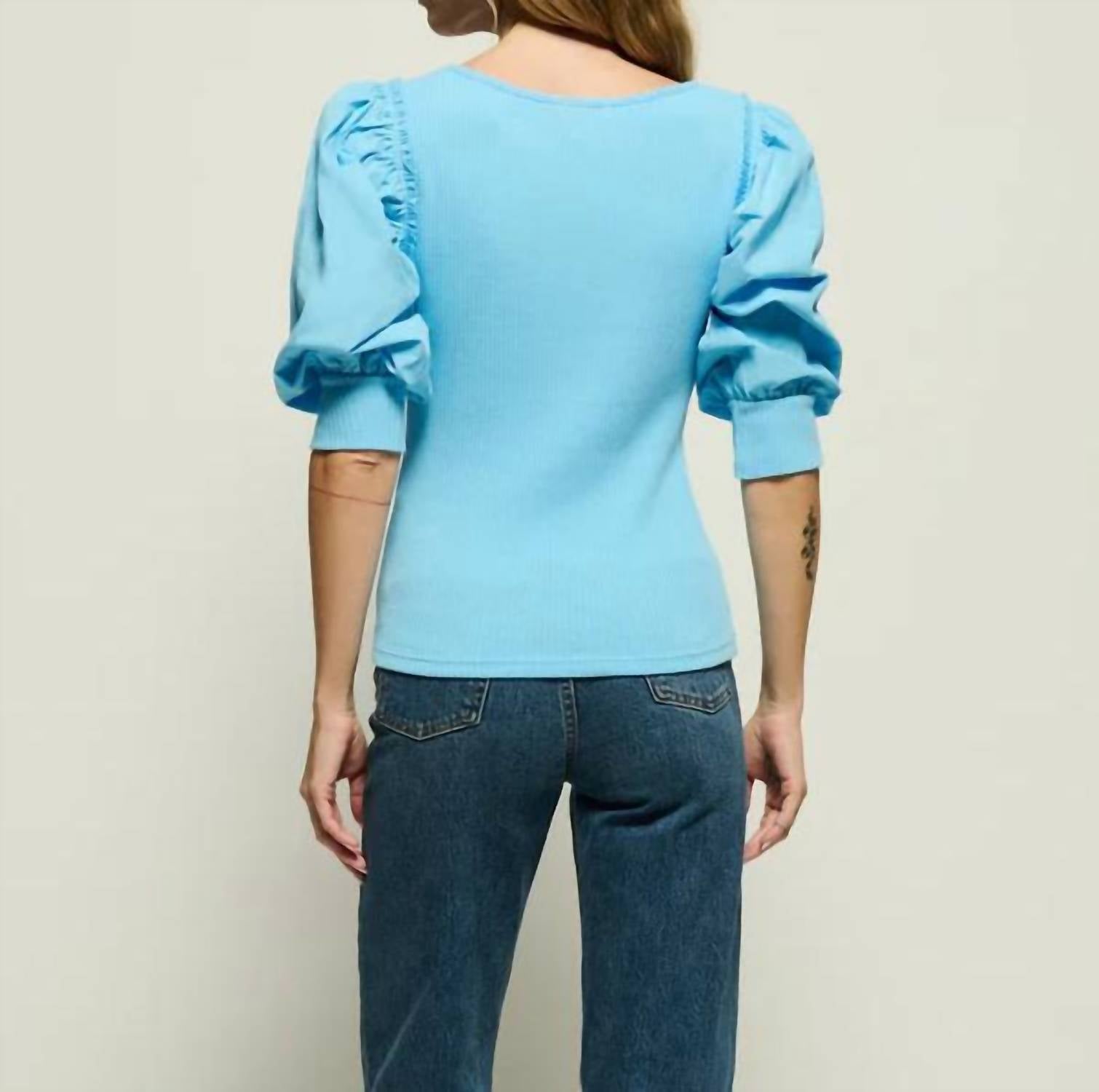 The Corynn Top by Nation LTD is a form-fitting blouse crafted for confident style, rendered in a dreamy Day Dream hue. It features three-quarter poplin puff sleeves, a polished scoop neckline, and is made from 100% organic Peruvian cotton for a soft, midweight feel. Material: Cotton. Closure: Pull-on. Care Instructions: Machine wash and line dry. Made in Peru.