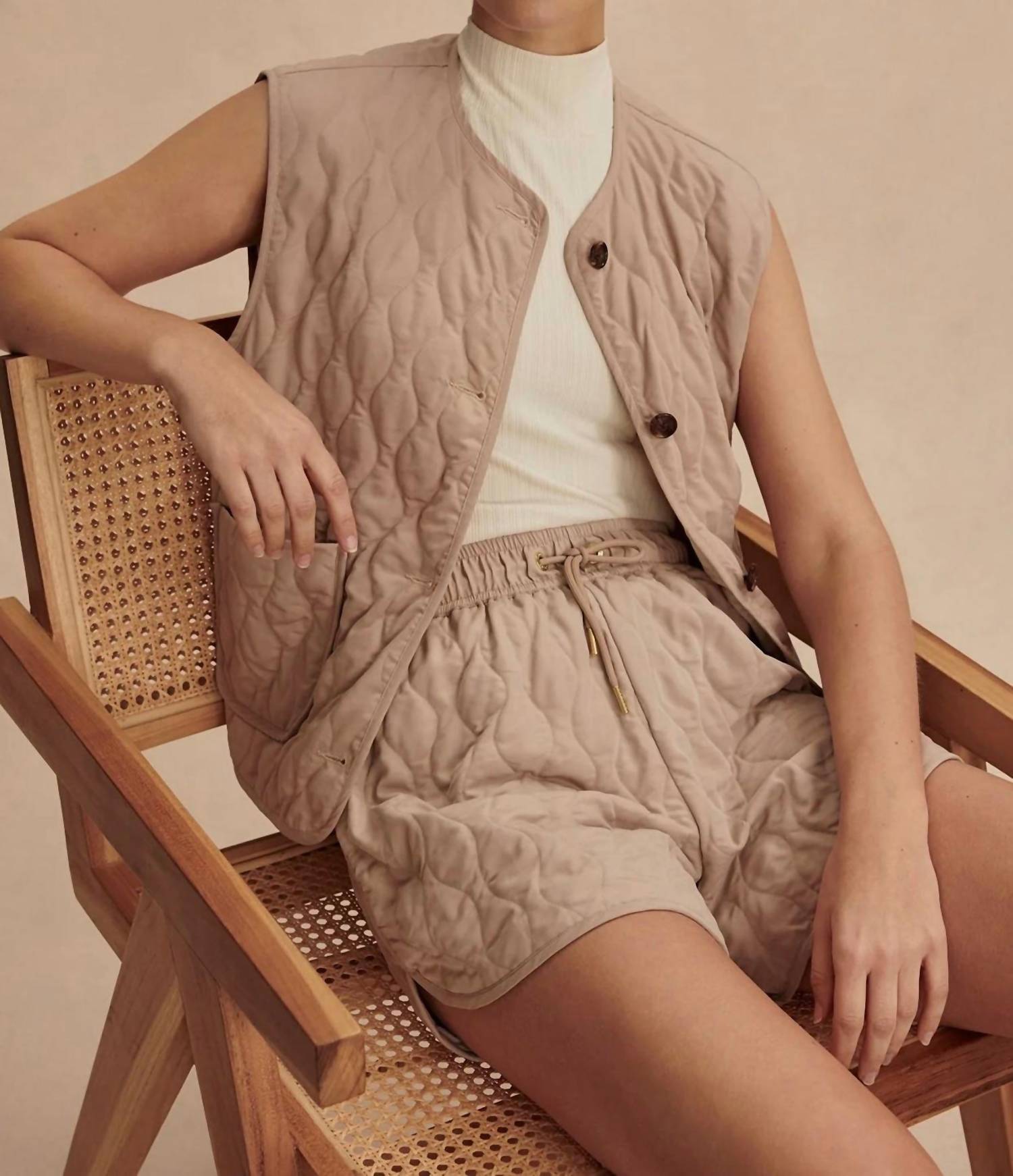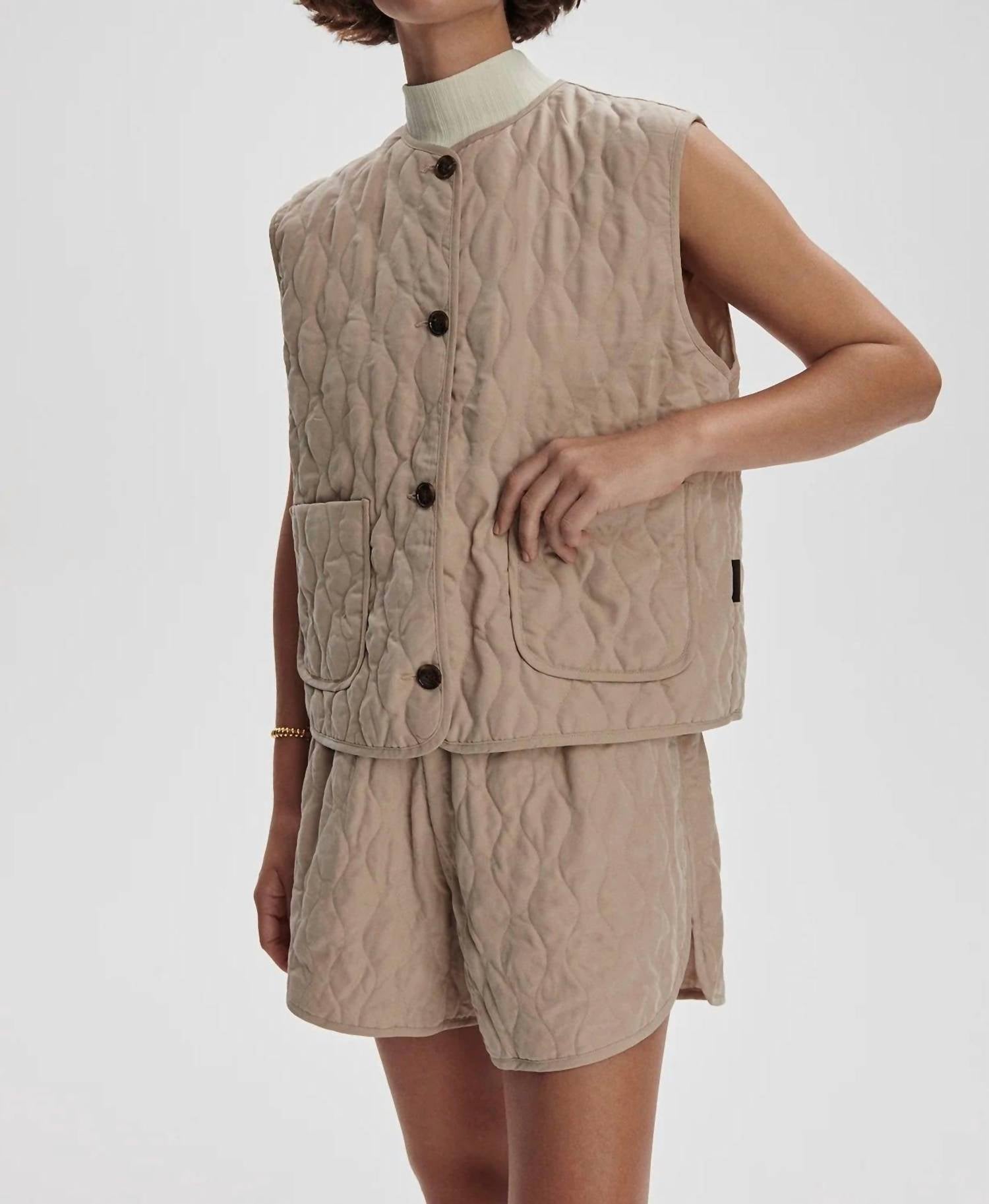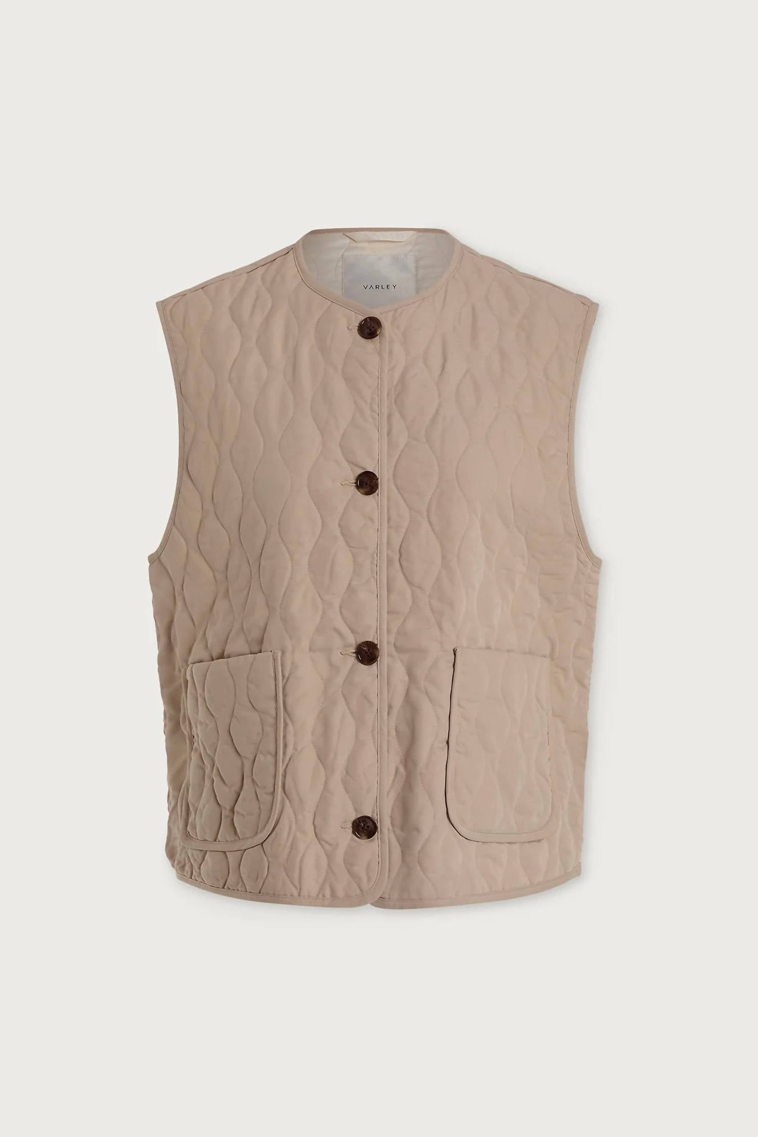 Elevate your fall wardrobe with the Karla Quilted Gilet by VARLEY, a sublime addition in light taupe that embodies quiet luxury. This sleeveless vest, designed with a textured viscose blend, features a button closure and is perfect for vacation occasions and the festive Christmas season. Enjoy added functionality with practical pockets, all within a lined and structured design. Care for your garment with ease: machine wash and lay flat to dry.