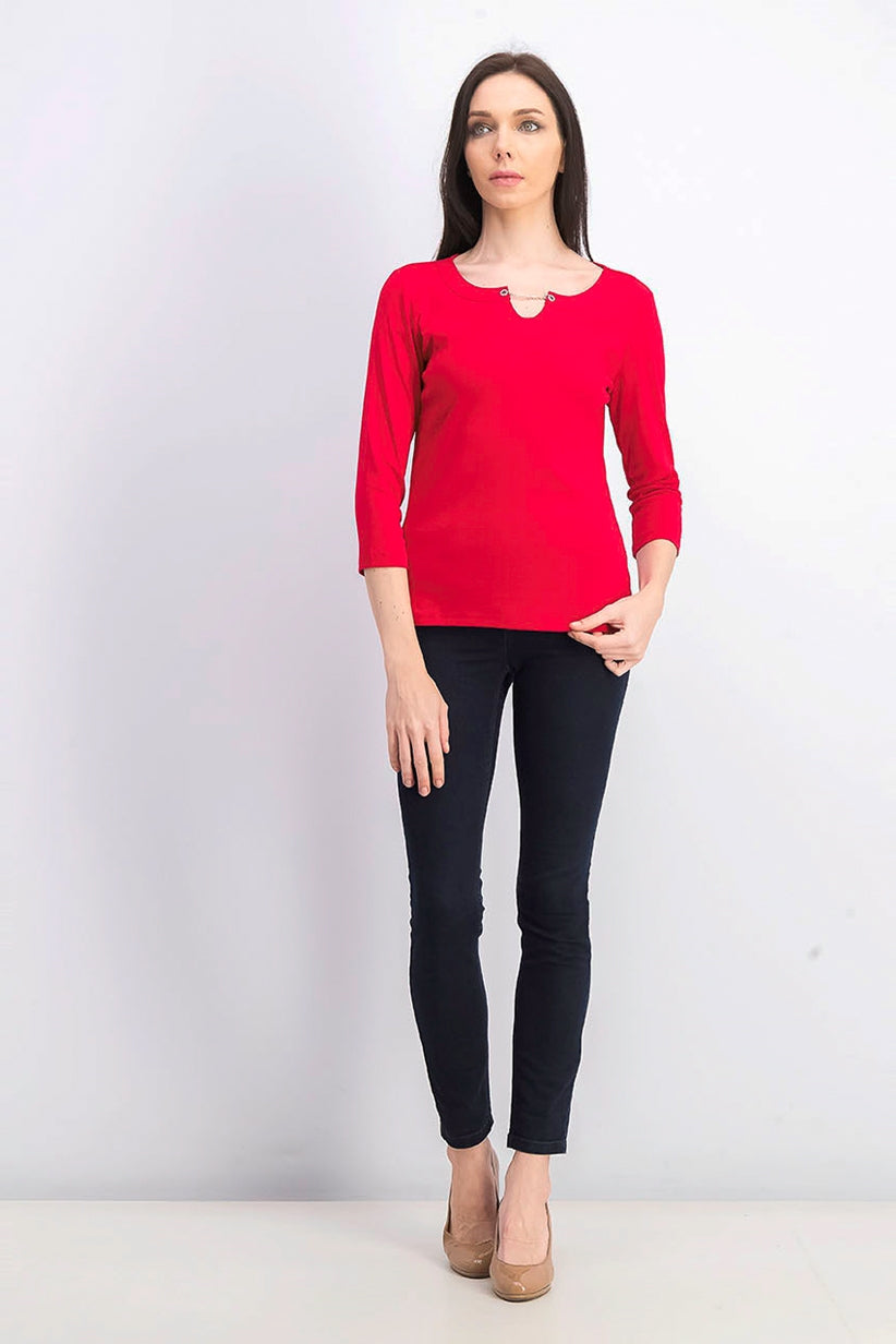 Ajustado; atinge o quadril; aprox. 66 cm de comprimento | Devido ao tamanho generoso, sugerimos um tamanho menor para um ajuste perfeito | Decote redondo com abertura | Detalhe de corrente no centro do decote | Mangas 3/4