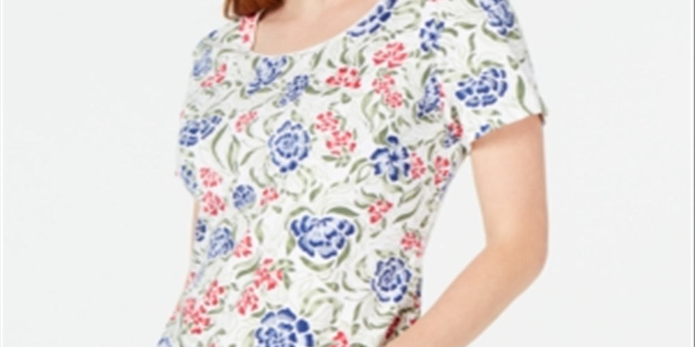 Eleve seu visual casual com a camiseta moderna de Karen Scott | estilizada com uma estampa floral vibrante e colorida. | Aproximadamente 26 de comprimento | Devido ao tamanho generoso | sugerimos um tamanho menor para um ajuste perfeito | Decote redondo |
