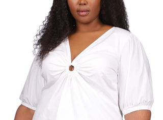 Blusa feminina Michael Kors de popeline de algodão com manga 3/4, branca, tamanho 2X