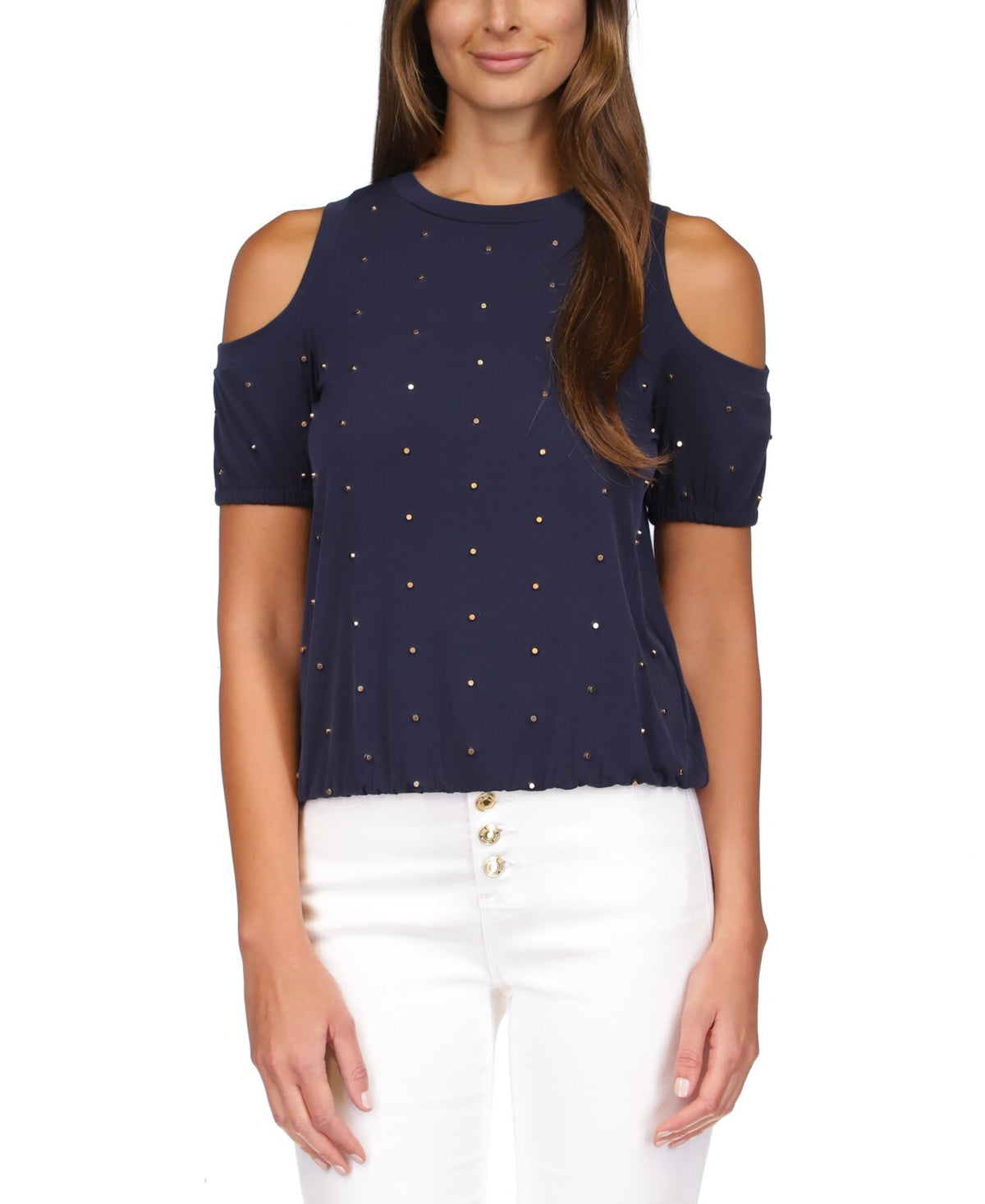 O Top Michael Michael Kors com Tachas e Ombros à Mostra é uma peça elegante e contemporânea que eleva seu guarda-roupa sem esforço. Confeccionado em jersey fosco de alta qualidade, este top apresenta recortes elegantes nos ombros à mostra que adicionam um toque moderno a uma silhueta clássica. A adição de tachas brilhantes realça seu apelo visual, tornando-o perfeito tanto para saídas casuais quanto para ocasiões mais elegantes. Este top representa a essência luxuosa e elegante característica da Michael Kors, garantindo que você se destaque onde quer que vá.