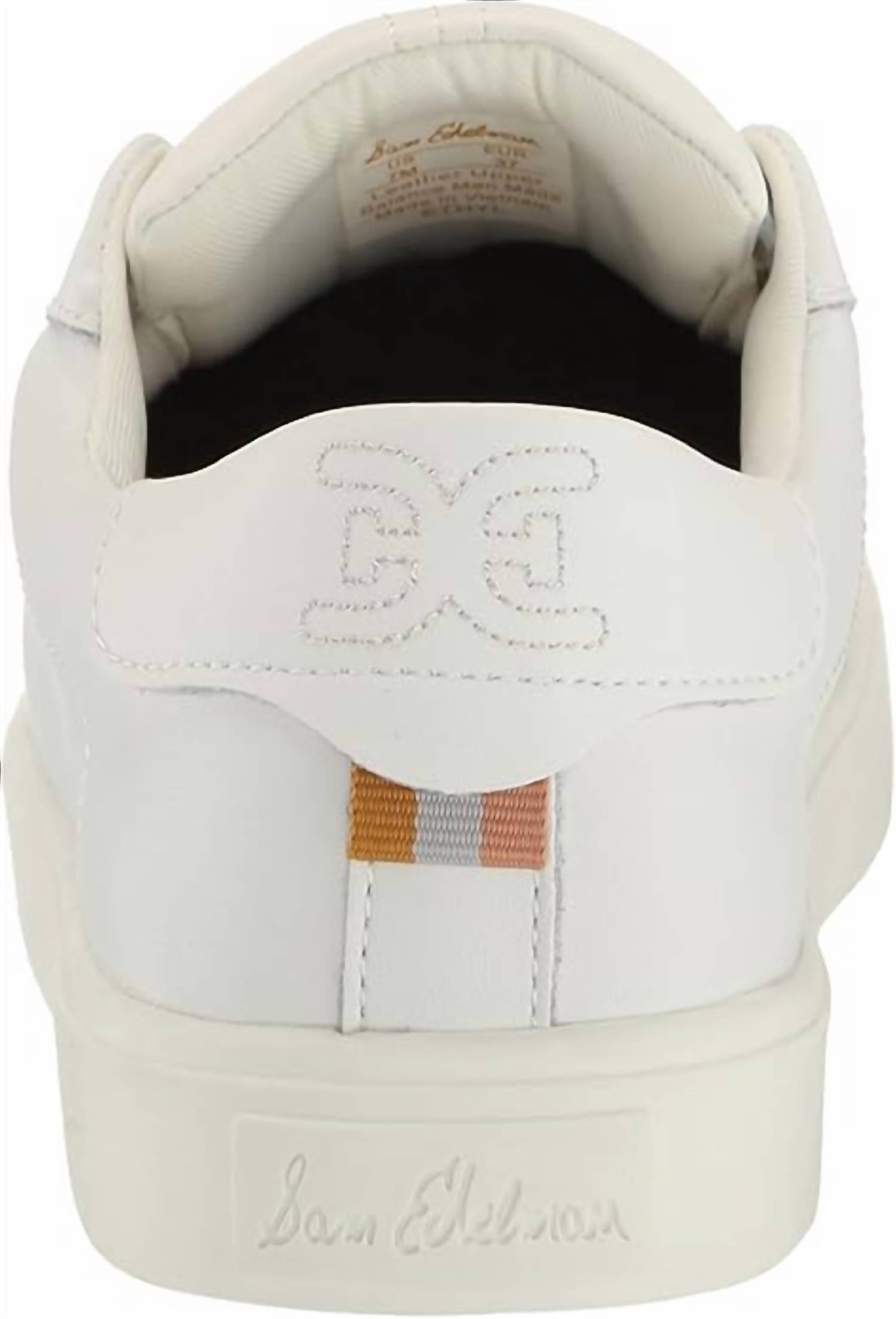 Dê seus passos diários com esses tênis adoráveis. Apresentamos o Tênis Feminino Ethyl Lace Up da Sam Edelman em couro branco, uma adição elegante e versátil à sua coleção de streetwear de verão. Este tênis possui cadarço ajustável e cabedal em couro luxuoso para um visual elegante. A palmilha removível, aliada ao forro e solado sintéticos, oferece conforto e durabilidade, com a altura adicional do salto plataforma de 2,5 cm. Feitos com cuidado artesanal, estes tênis importados combinam estilo e praticidade, perfeitos para viagens e uso diário.