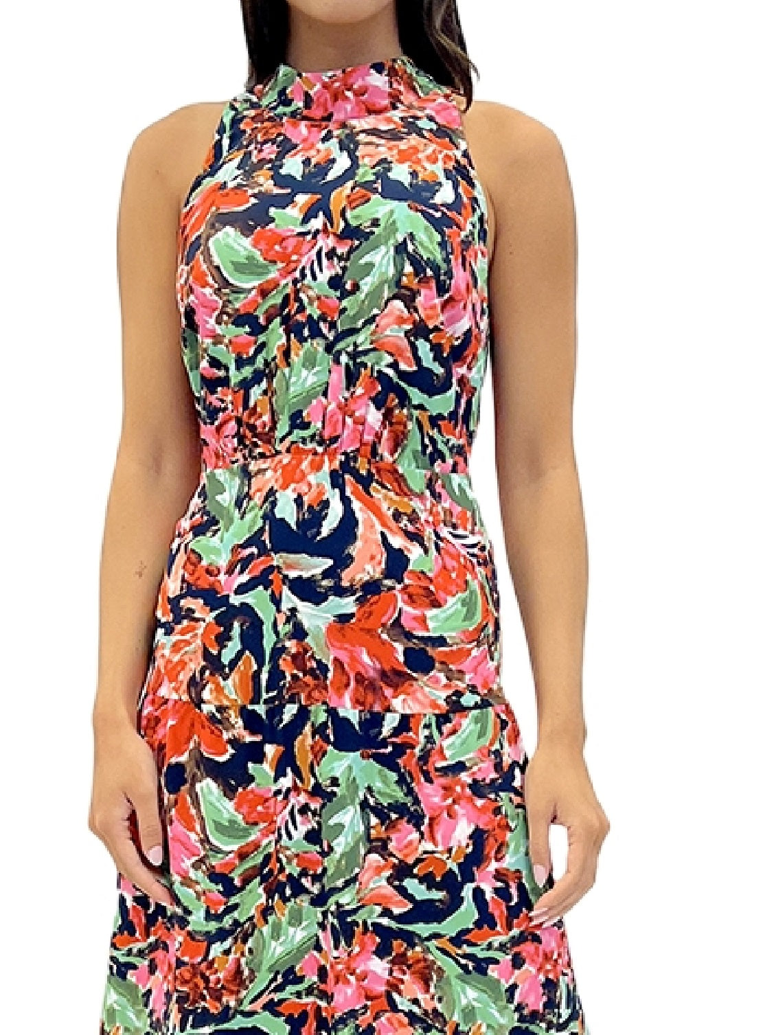 Flores com pinceladas criam uma paisagem encantadora em um vestido midi versátil, projetado para destacar seus ombros | Comprimento frontal central 50 (tamanho 8) Decote halter Sem mangas | Com ombros vazados Corpete forrado 100% poliéster Lavagem a seco Importado