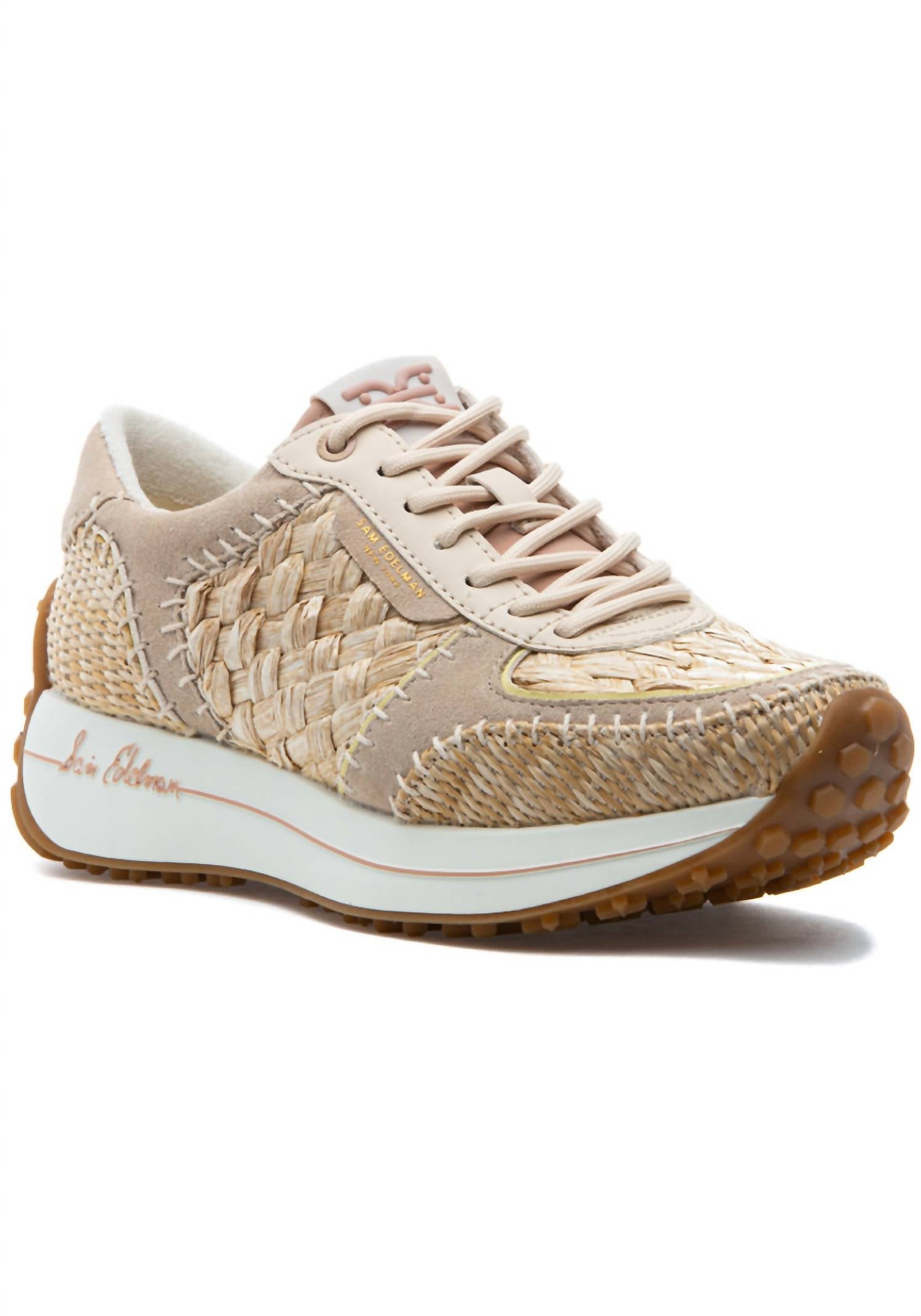Estes tênis com painéis mistos apresentam um design dinâmico com pespontos e camadas tom sobre tom, combinando couro, tecido e materiais sintéticos. O calçado tem salto de 4 cm e plataforma de 2,5 cm, enquanto a palmilha sintética proporciona um ajuste confortável.