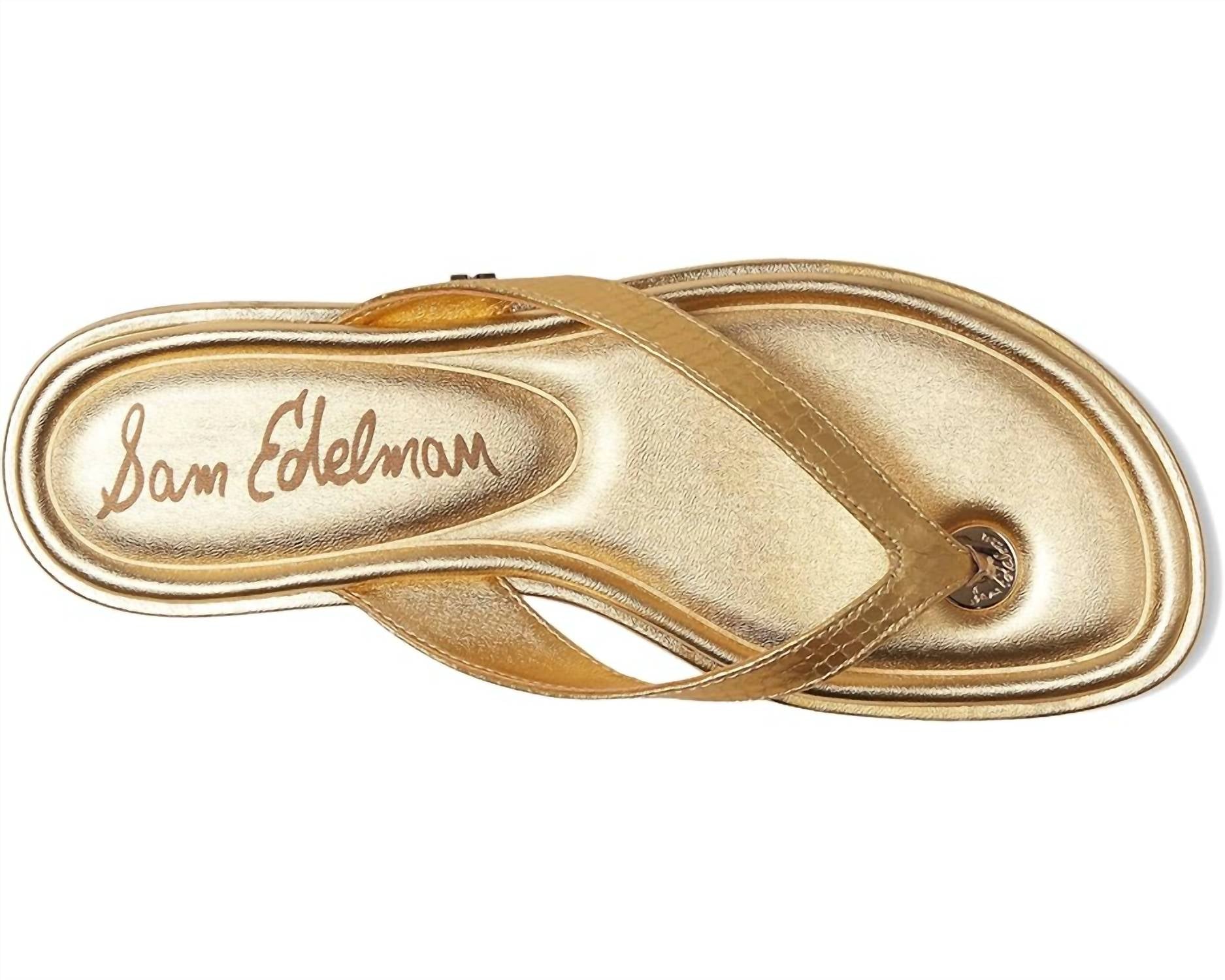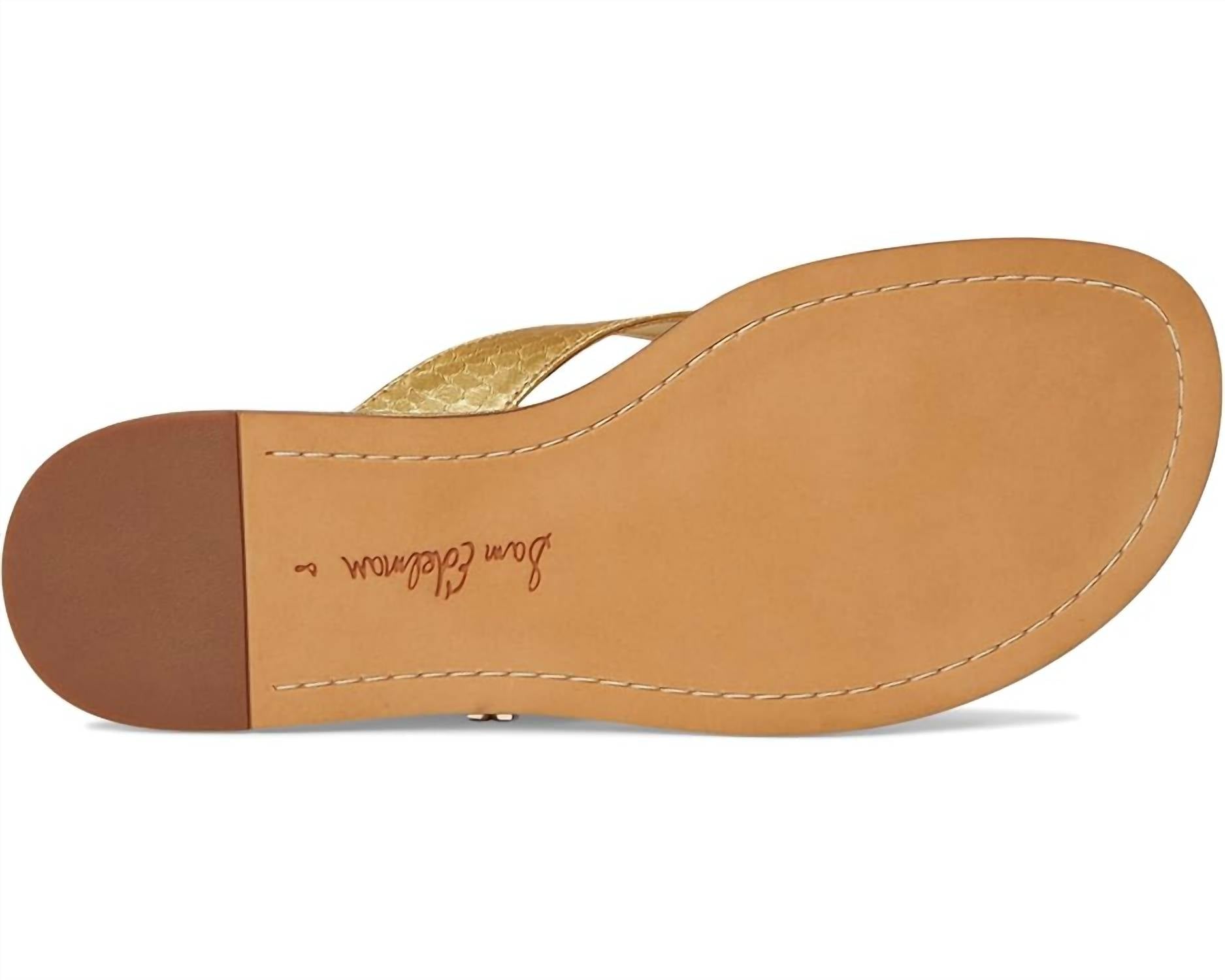 Eleve seu guarda-roupa de verão com o chinelo feminino Remi Leather da Sam Edelman, na elegante cor Goldboa, para um toque de luxo. Confeccionada com cabedal, forro e palmilha de couro, esta sandália apresenta bico redondo aberto e salto baixo, complementado por um solado acolchoado para máximo conforto. Com um prático estilo slip-on e detalhes da marca na palmilha, é um item essencial minimalista, ideal tanto para dias de praia quanto para passeios casuais. O solado em borracha termoplástica (TPR) proporciona durabilidade e, com salto de 1/4 de polegada e 170 g de peso, é perfeita para um uso sem esforço. As medidas foram tiradas com o tamanho 8, largura M, e podem variar de acordo com o tamanho. Importado.