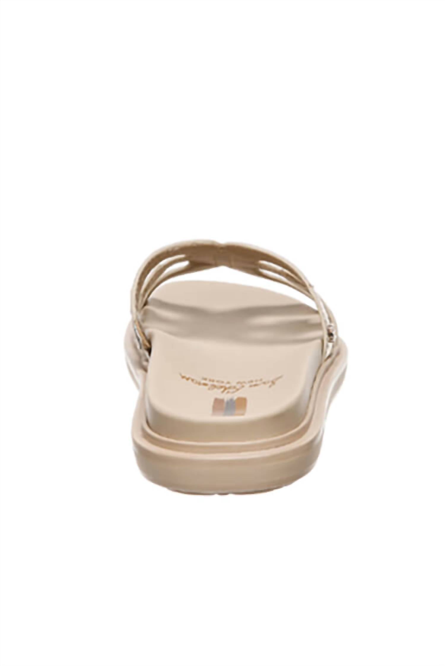 Entre na sandália feminina Valeri Slide da Sam Edelman, uma versão moderna de um estilo atemporal. Confeccionada em couro folheado a ouro, esta sandália apresenta um design aberto nos dedos e um fecho slip-on confortável. Com palmilha acolchoada, oferece conforto o dia todo com um salto plataforma de 1,2 cm. Ideais para a mulher antenada na moda, estas sandálias combinam estilo e praticidade sem esforço.