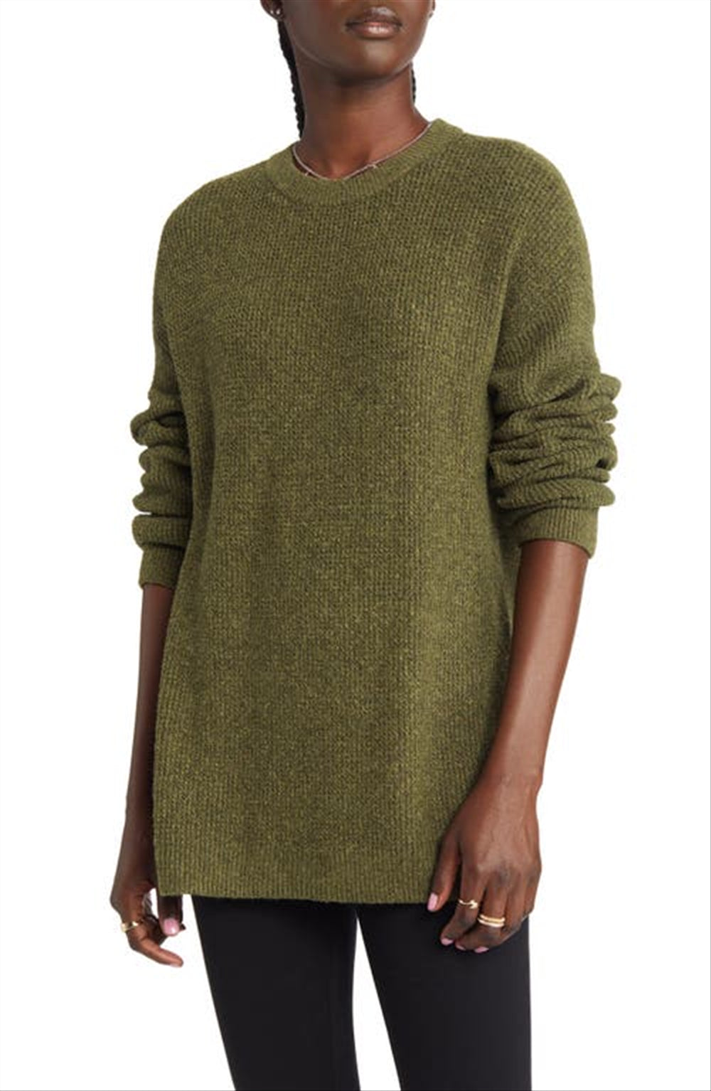 Ajuste oversized para um visual relaxado e confortável | Tecido macio perfeito para sobreposições | Cor verde oliva escura versátil para vários looks