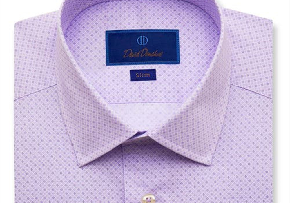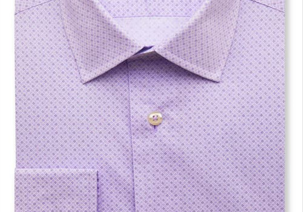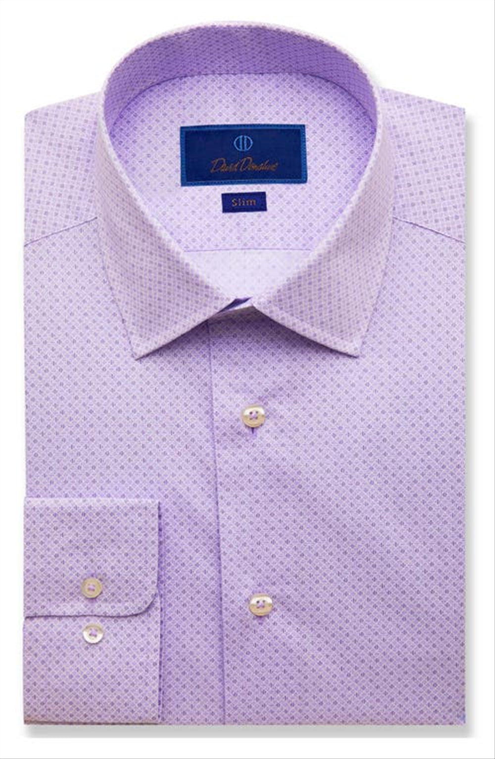Design slim fit | Estampa geométrica | Material 100% algodão | Tamanho 16,5 - 32 | Opção de cor lilás | Tecido de qualidade superior | Feito por David Donahue | Essencial para eventos formais | Pode ser lavado na máquina | Vendido na Nordstrom.