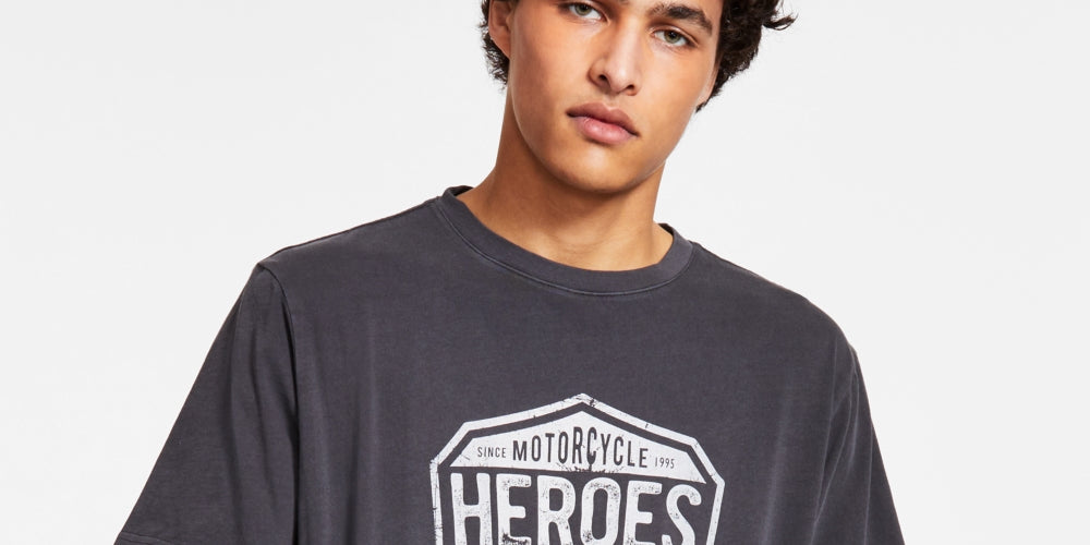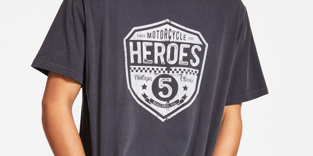 Lavada para uma sensação de uso perfeito e com acabamento com logotipo gráfico desgastado na frente | esta camiseta de algodão da Heroes Motors confere um visual de inspiração vintage ao seu estilo urbano | (Liquidação)