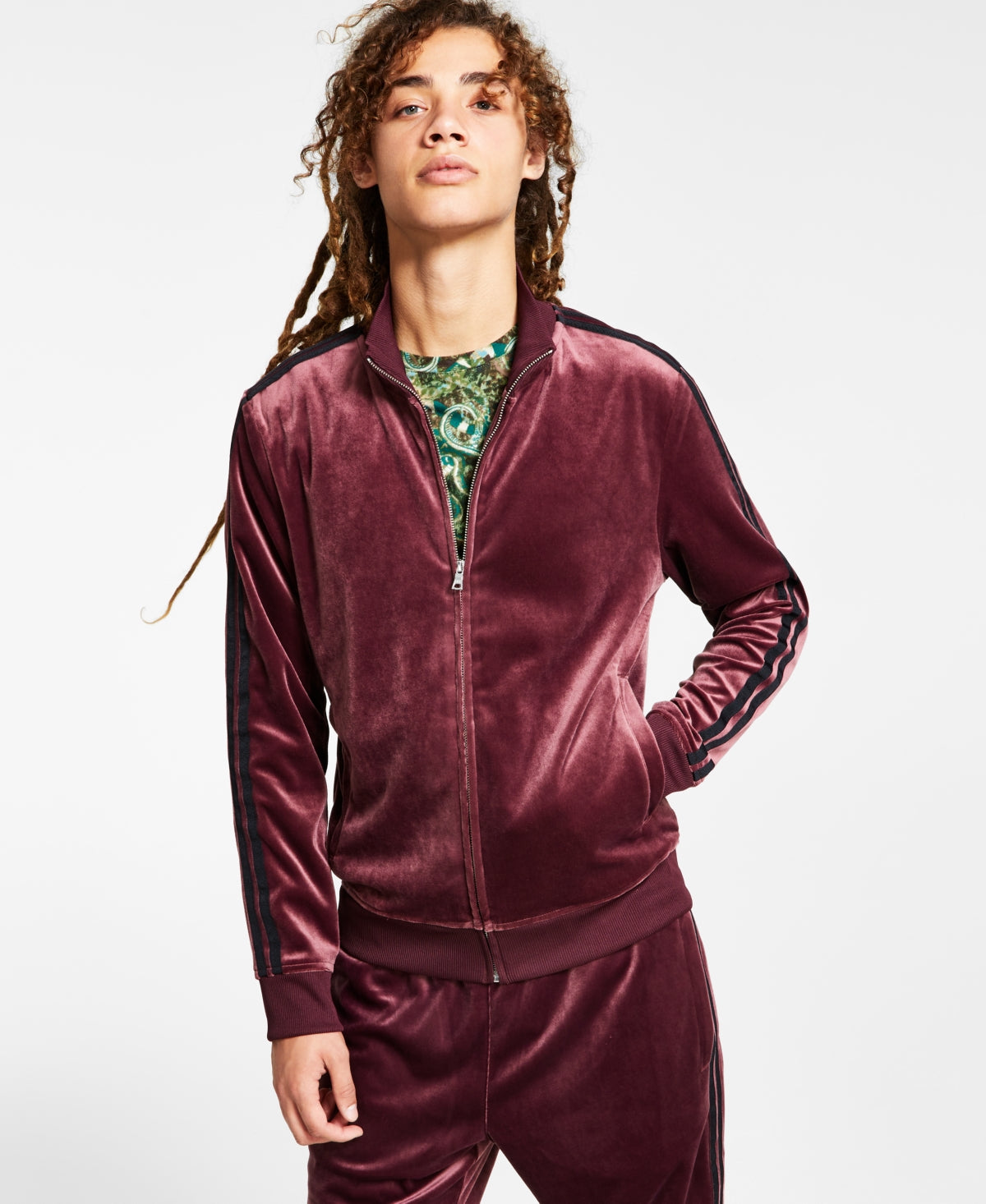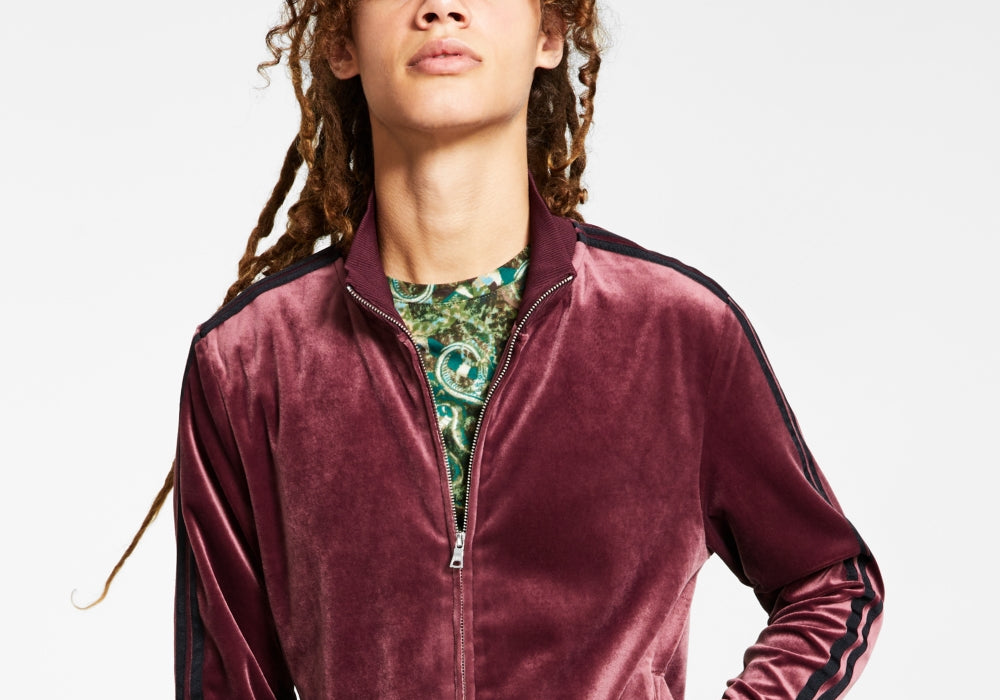 Deixe seu estilo descontraído brilhar com o veludo cintilante e as listras contrastantes nas mangas desta jaqueta esportiva incrivelmente confortável da INC International Concepts®. | | Importado | Dois bolsos frontais para as mãos | Gola falsa em malha canelada; fecho frontal com zíper completo | Listras contrastantes nas mangas; punhos e bainha em malha canelada