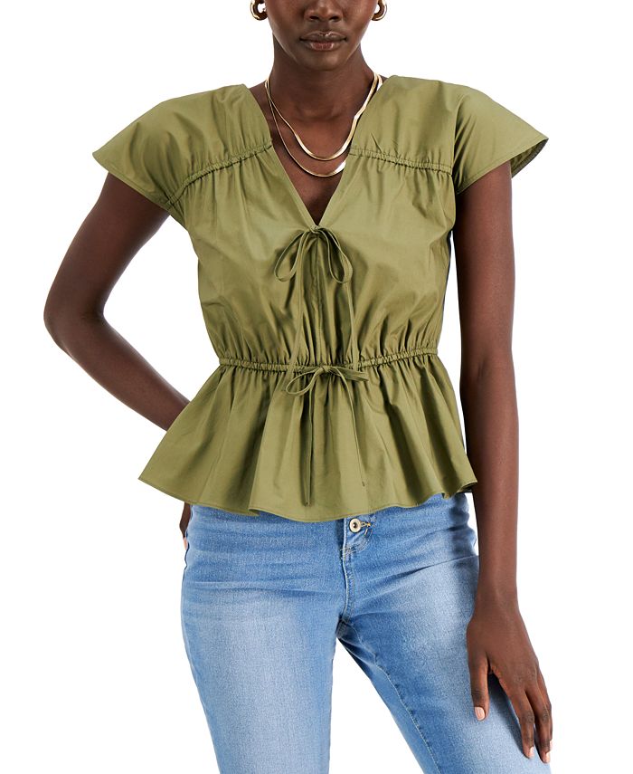 O franzido perfeito leva este top de algodão com decote em V da INC International Concepts® a novos patamares na moda. | Ajuste fácil | Decote em V | Detalhes com cordão e amarração | | Todo em algodão | Lavável à máquina